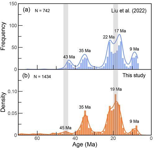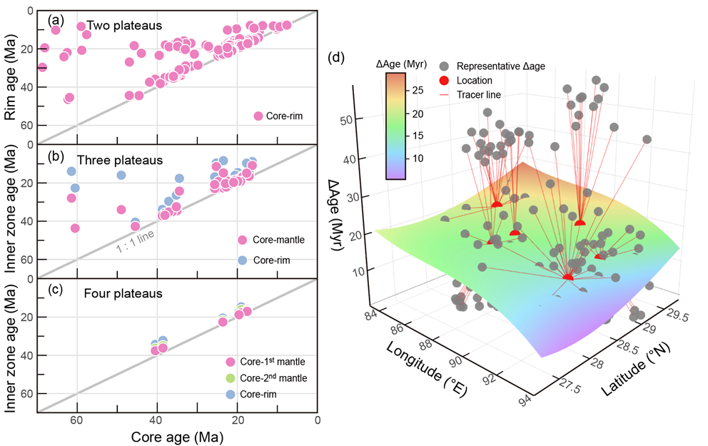 (2)揭示喜马拉雅淡色花岗岩的多阶段岩浆演化历史:ADEPT分析结果显示,约74%的锆石颗粒保存了2–4个年龄平台,并且厘定了四个主要岩浆峰期:45 ± 2 Ma、35 ± 3 Ma、19 ± 4 Ma和9 ± 2 Ma。相比于前人手动分割结果,主要存在两点不同(图3):ADEPT将43 ± 3 Ma峰值修正为45 ± 2 Ma;将25–13 Ma区间识别为一个宽峰,表明该时期存在持续的岩浆活动。