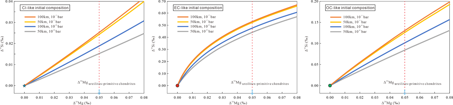 由于Mg与Si的半凝聚温度相近(Mg:1336 ℃;Si:1310 ℃;Lodders, 2003),Ureilites中Mg-Si同位素的解耦表明,其前体物质在挥发前应具有更轻的Si同位素组成。轻Si通常被视为极端还原环境的指示(如顽火辉石球粒陨石及其无球粒陨石:Enstatite chondrites、Aubrites),因此Ureilites的最初形成环境亦可能极为还原。