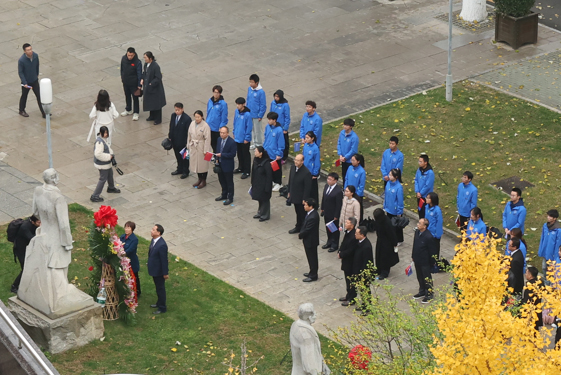 仪式结束后,全体在校校领导、师生代表缓步来到地质图书馆前向李四光、何长工、刘型和高元贵四位元勋雕像敬献花篮。师生鞠躬致敬,花篮整齐摆放,仪式简单庄重。