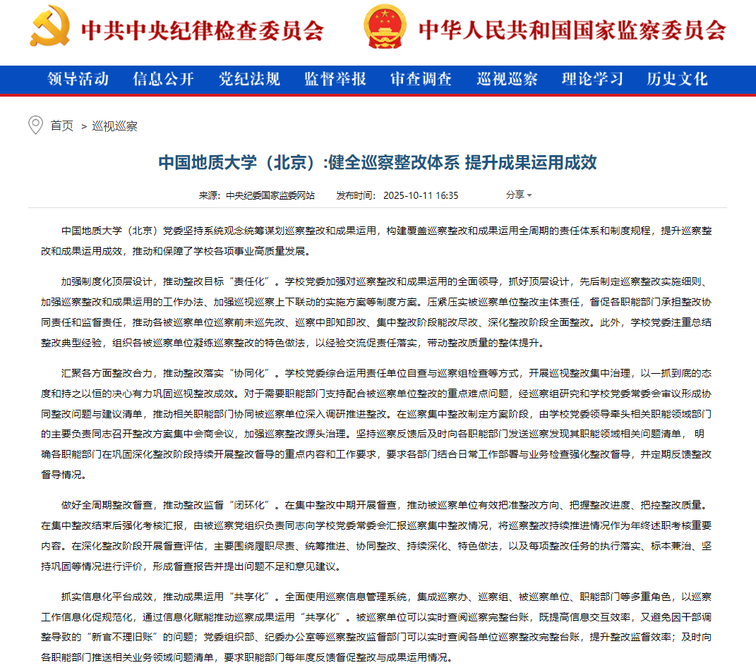 中国地质大学(北京)党委坚持系统观念统筹谋划巡察整改和成果运用,构建覆盖巡察整改和成果运用全周期的责任体系和制度规程,提升巡察整改和成果运用成效,推动和保障了学校各项事业高质量发展。