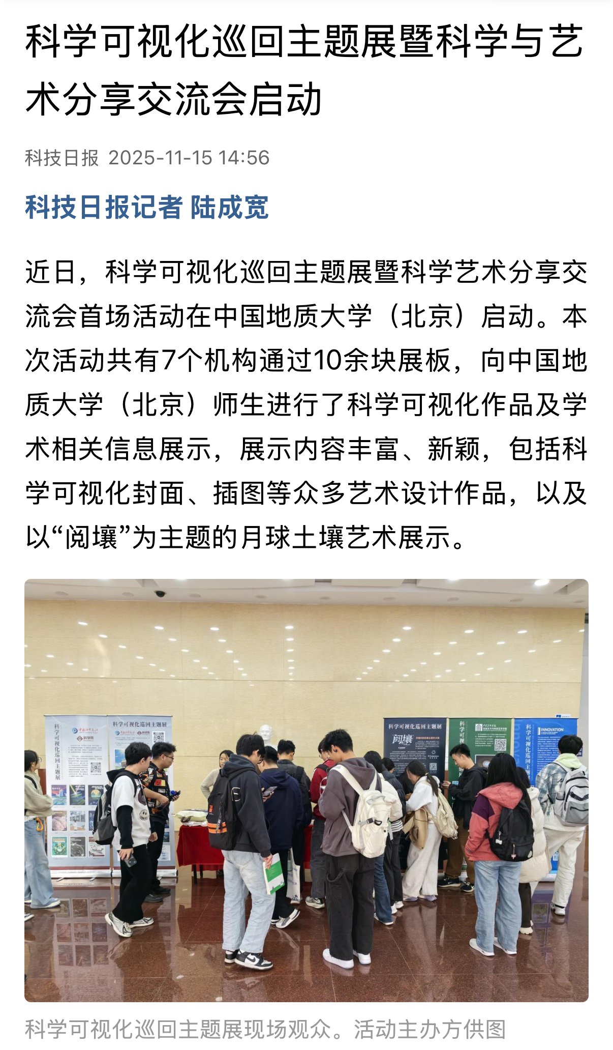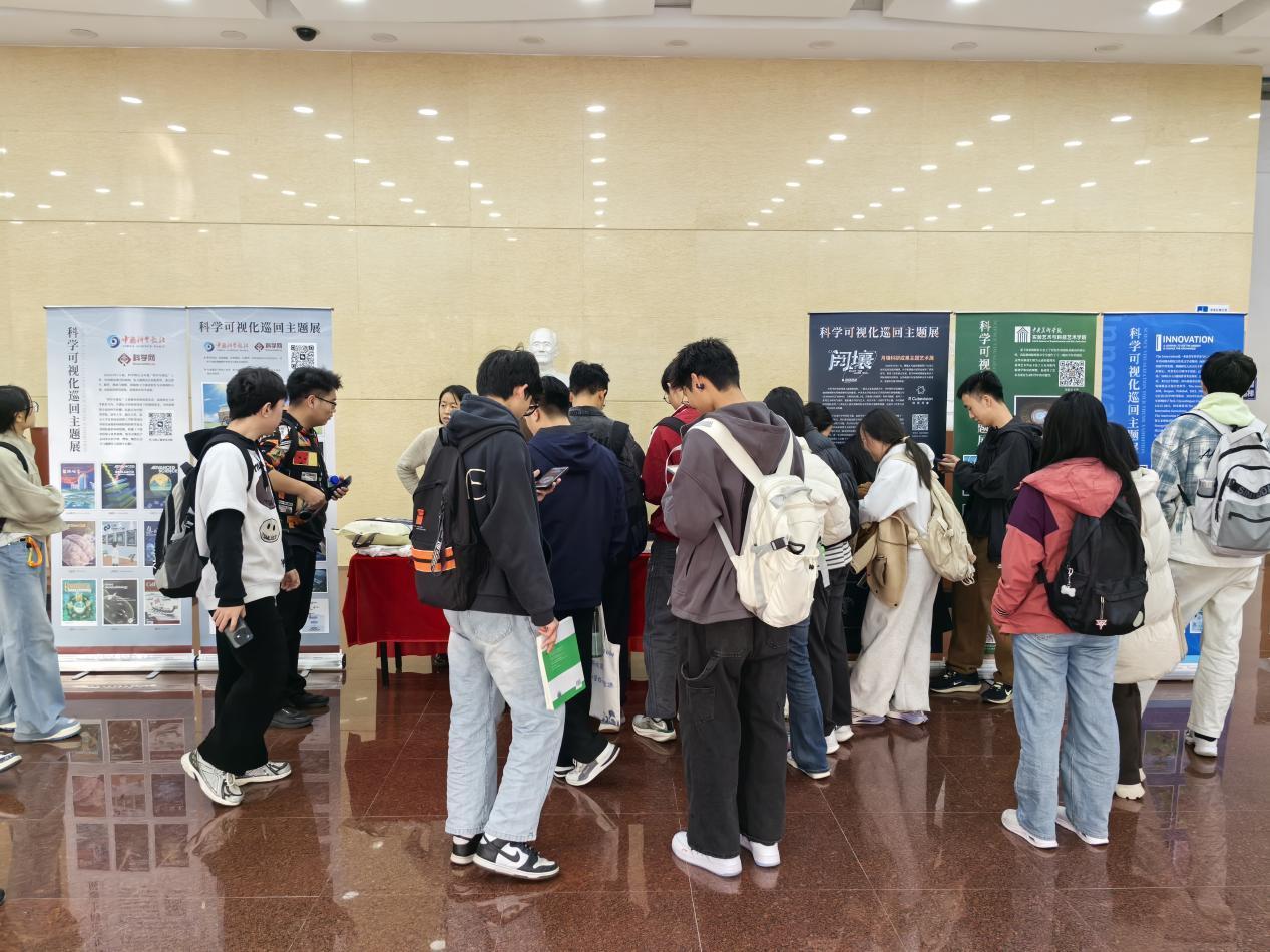 近日,科学可视化巡回主题展暨科学艺术分享交流会首场活动在中国地质大学(北京)启动。本次活动共有7个机构通过10余块展板,向中国地质大学(北京)师生进行了科学可视化作品及学术相关信息展示,展示内容丰富、新颖,包括科学可视化封面、插图等众多艺术设计作品,以及以“阅壤”为主题的月球土壤艺术展示。