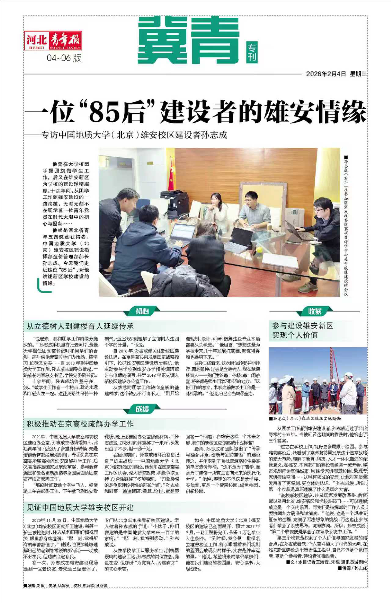 从在学校学工口服务学生,到机器轰鸣的建设工地,孙志成的岗位在变,角色在变,但那份“为党育人、为国育才”的初心未变。如今,雄安校区的建设已全面展开,预计2027年9月,一期工程将完工,具备1万名学生入住条件。“到时候,我会第一批报名去雄安校区工作,能亲眼看看我们规划的蓝图变成现实的样子,实在是件幸运的事。”他说,希望将来的学弟学妹们,能在我们建设的校园里,安心读书、大胆创新。