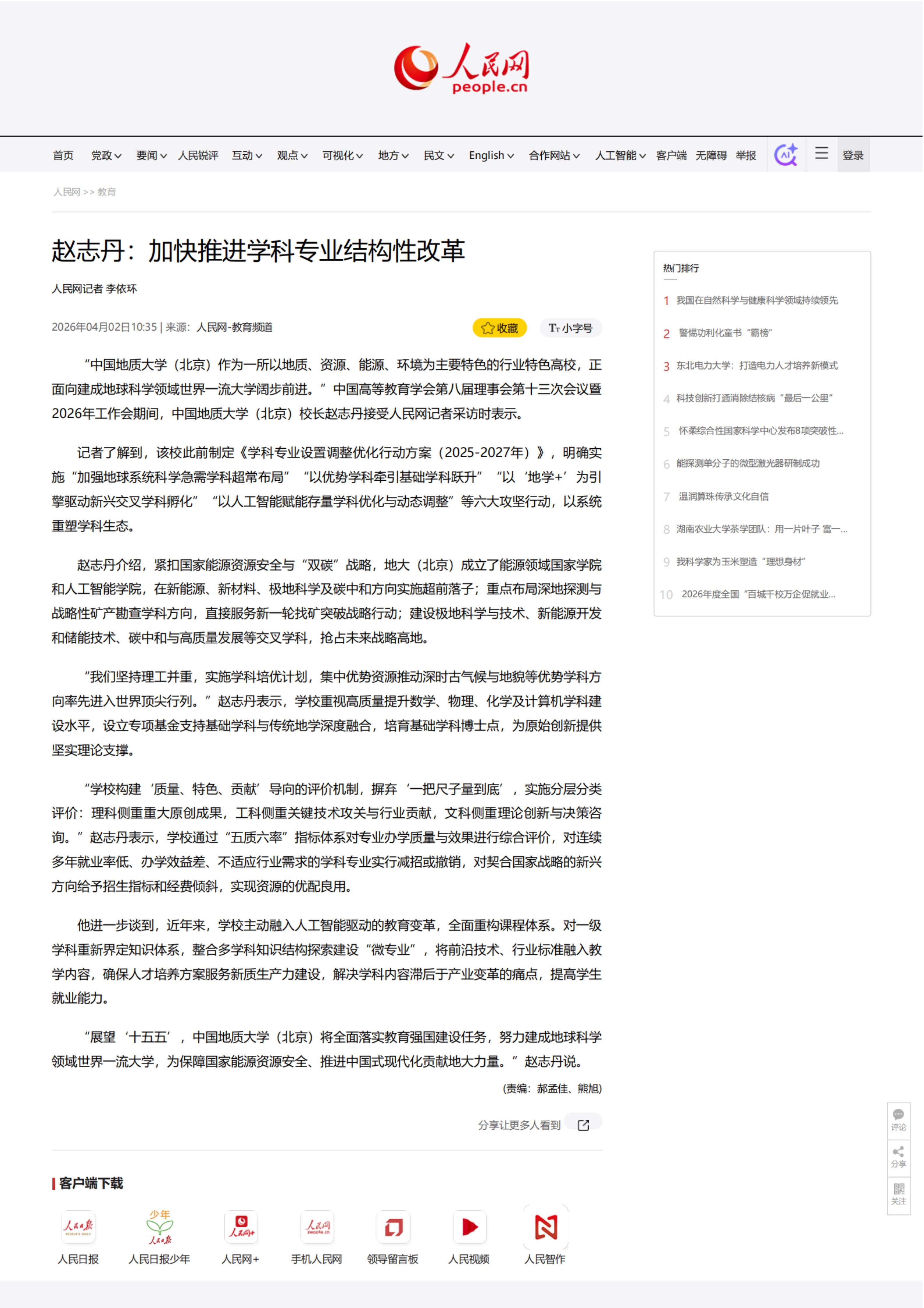“中国地质大学(北京)作为一所以地质、资源、能源、环境为主要特色的行业特色高校,正面向建成地球科学领域世界一流大学阔步前进。”中国高等教育学会第八届理事会第十三次会议暨2026年工作会期间,中国地质大学(北京)校长赵志丹接受人民网记者采访时表示。