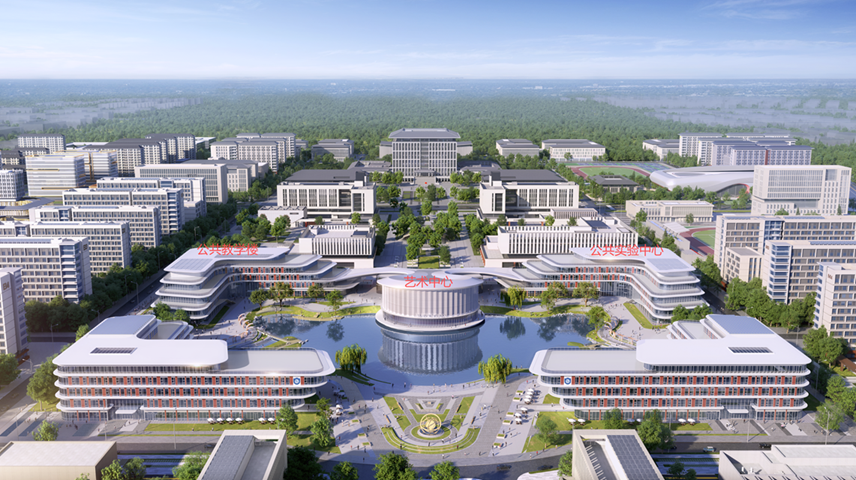整个校园由南至北形成“占高地、上高原、攀高峰”的规划意向,构建“一轴两核”的空间格局。“一轴”是贯穿校园南北的发展主轴,南主校门、生态湖、图书馆由南至北依次布置,中央绿带贯穿南北校区,形成融合景观、功能、精神为一体的校园主轴。“两核”即南校区打造以生态湖为景观核心的国际现代化建筑风格,北校区打造以图书馆为文化核心的中式现代化建筑风格。