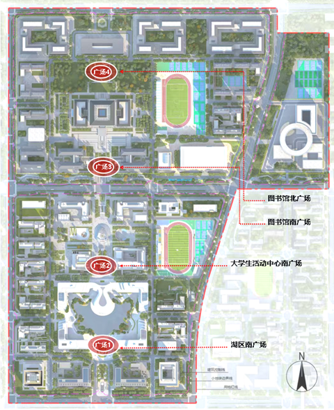 广场2:大学生活动中心南侧广场,拟重点打造开敞、简约的校园广场空间。