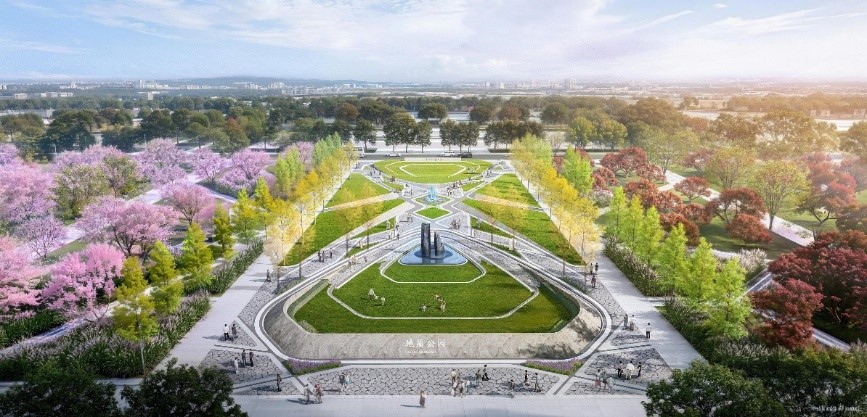 广场1:湖区南侧广场,本广场为南区最重要的广场,拟在广场中央设置地球科学主题雕塑。