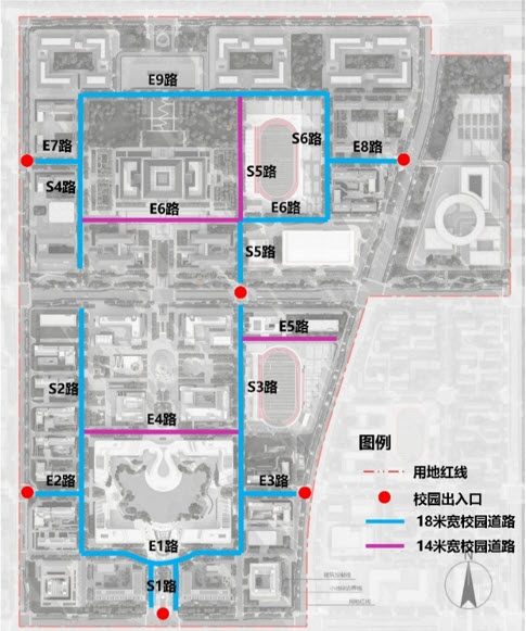 南校区南北方向的S1、S2、S3,东西方向的E1、E2、E3、E4、E5,北校区南北方向的S4、S5、S6,东西方向的E6、E7、E8、E9,共计道路15条。