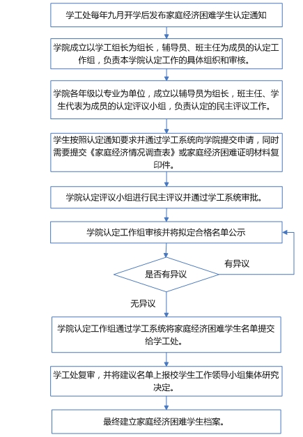 家庭经济困难学生认定工作每学年进行一次,学工处统一通知学院具体时间,必须规范工作程序,切实做到公开、公平。