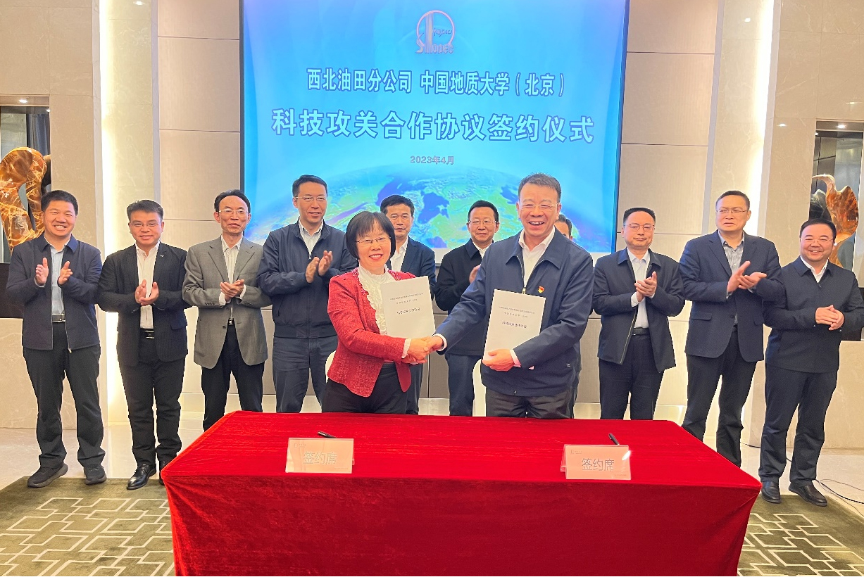 交流期间,雷涯邻和张煜分别代表中国地质大学(北京)、中国石油化工股份有限公司西北油田分公司签订合作协议。
