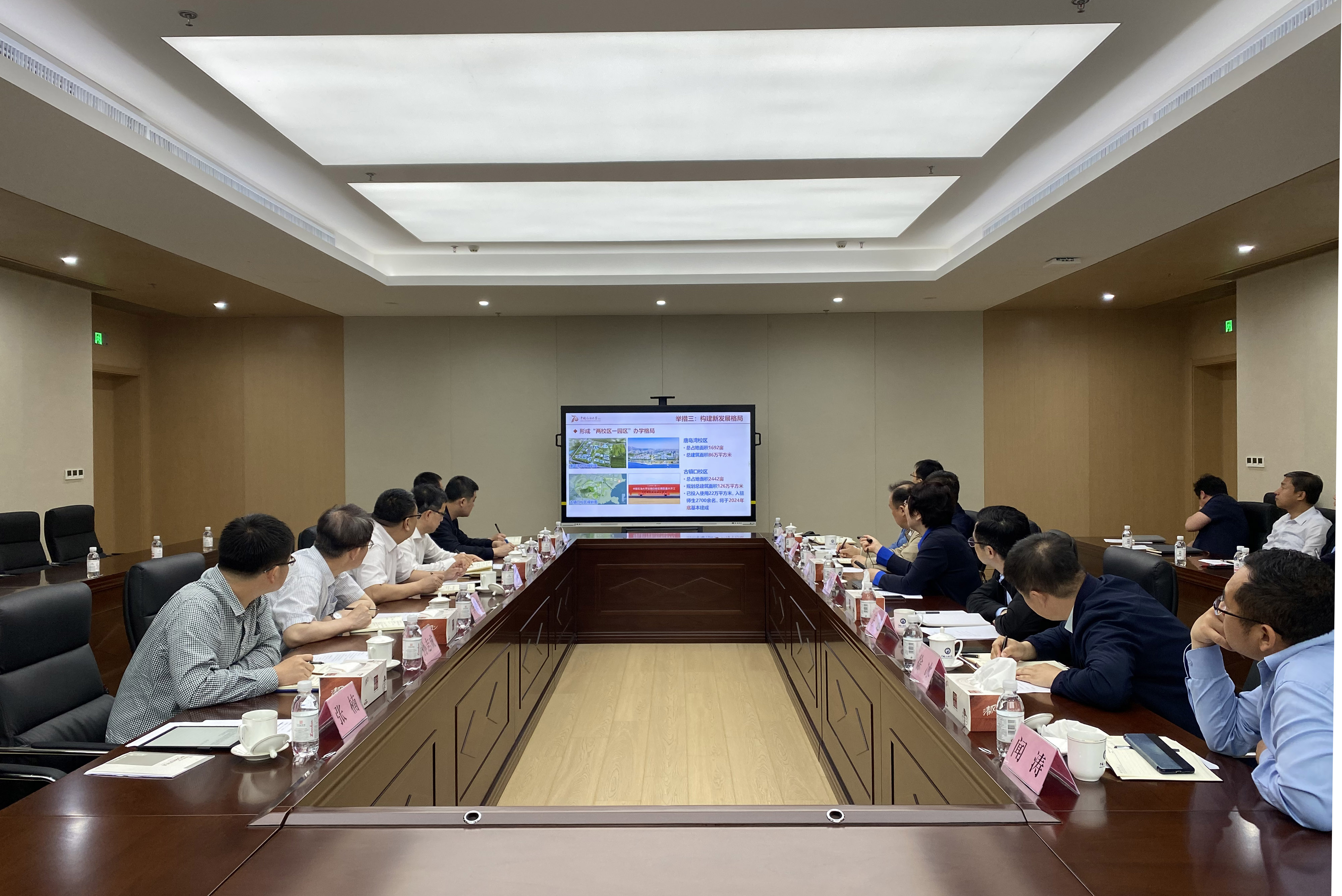 在中国海洋大学,校长助理、管理委员会副主任、西海岸校区建设指挥部总指挥于利陪同武雄一行参观了西海岸校区,并介绍了中国海洋大学新校区建设情况。座谈会上,于利着重就校园建设的规划、动员,校园绿化及景观建设等工作情况进行了分享。
