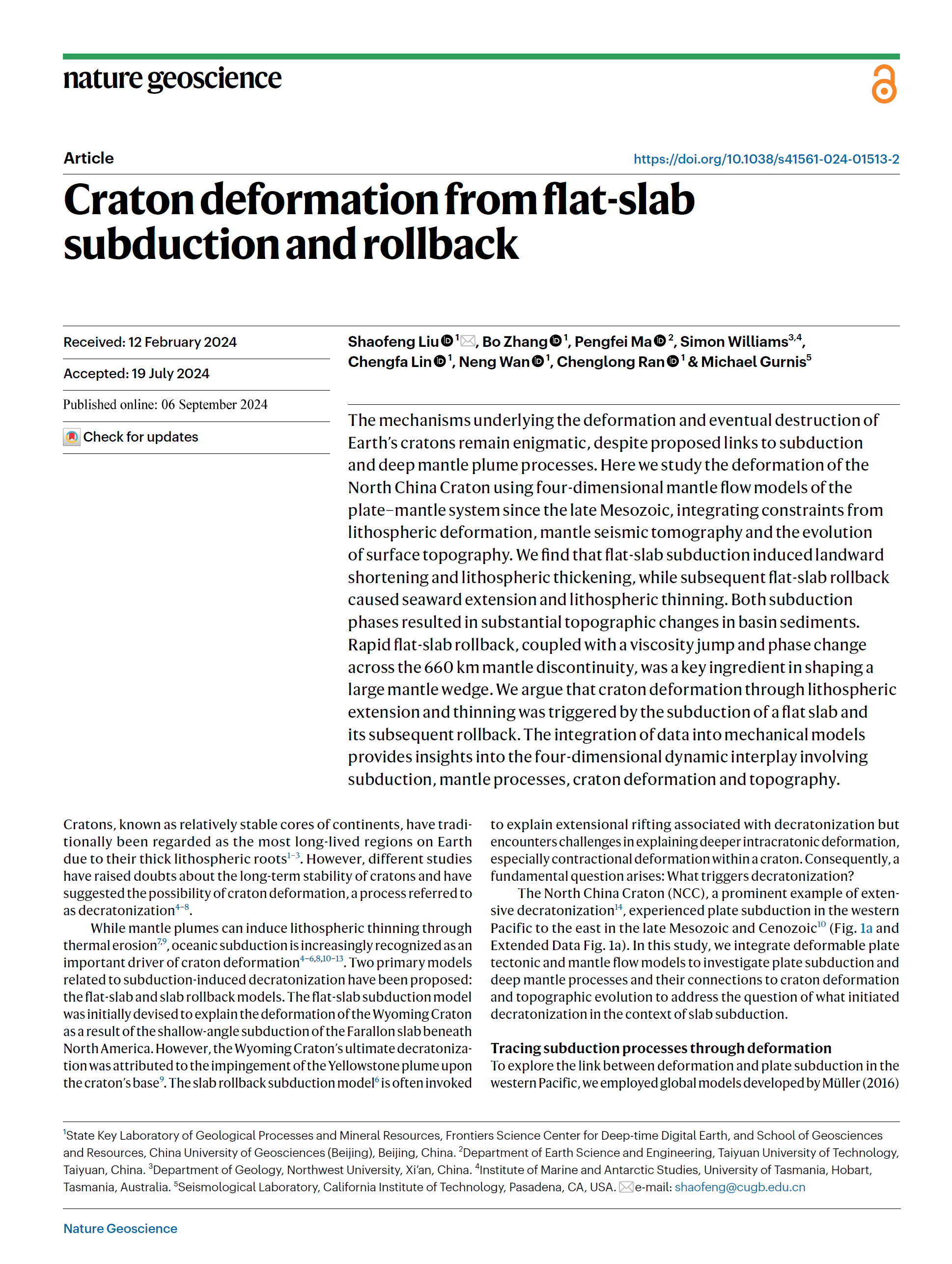 近日,我校刘少峰教授团队在国际知名学术期刊《Nature Geoscience》发表了创新性研究成果,题为“Craton deformation from flat-slab subduction and rollback”(平板后撤式俯冲诱发克拉通变形)(https://www.nature.com/articles/s41561-024-01513-2)。该研究由刘少峰教授团队与国际科学家合作完成,刘少峰教授为论文的第一作者和通讯作者,我校为第一作者单位和通讯作者单位。