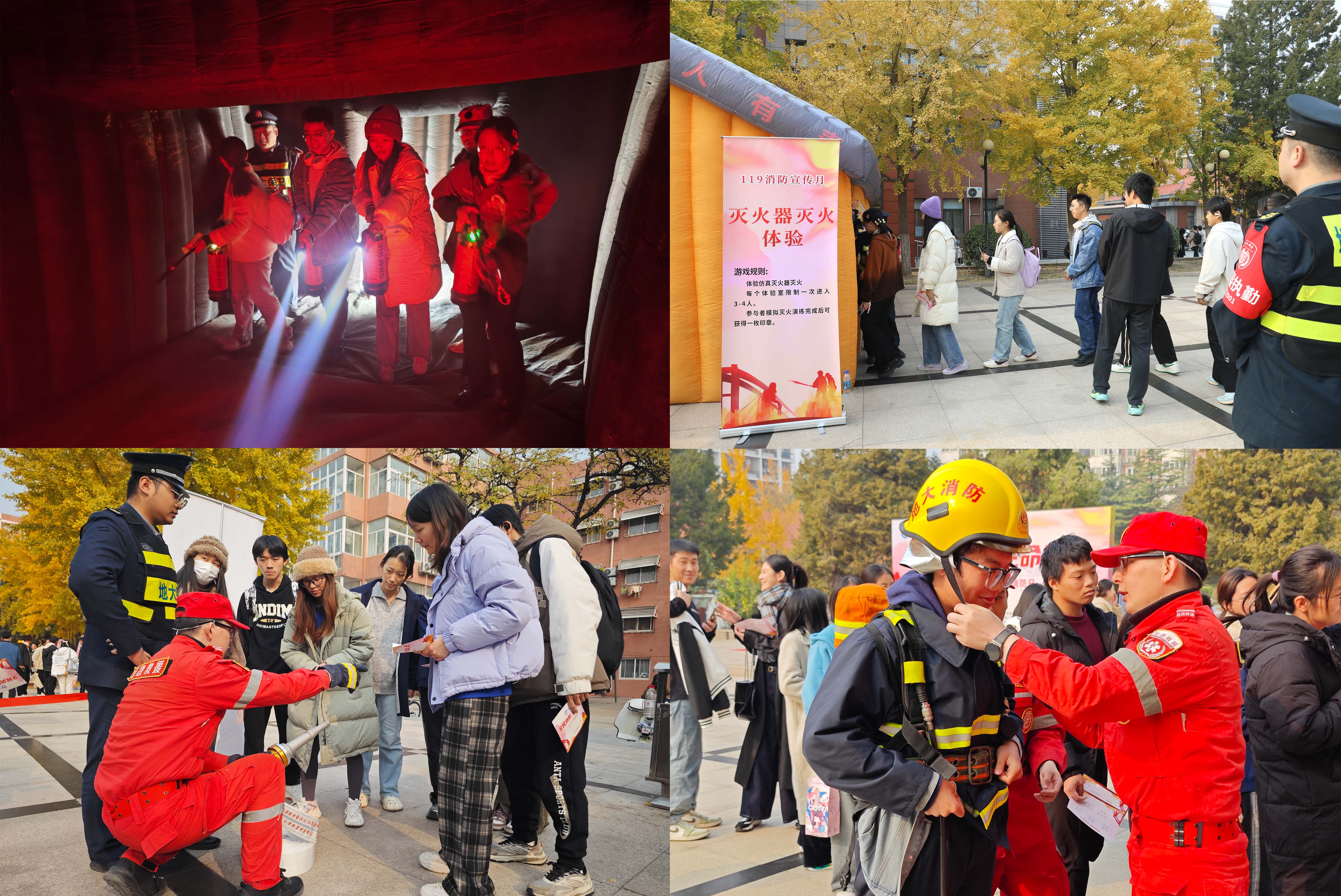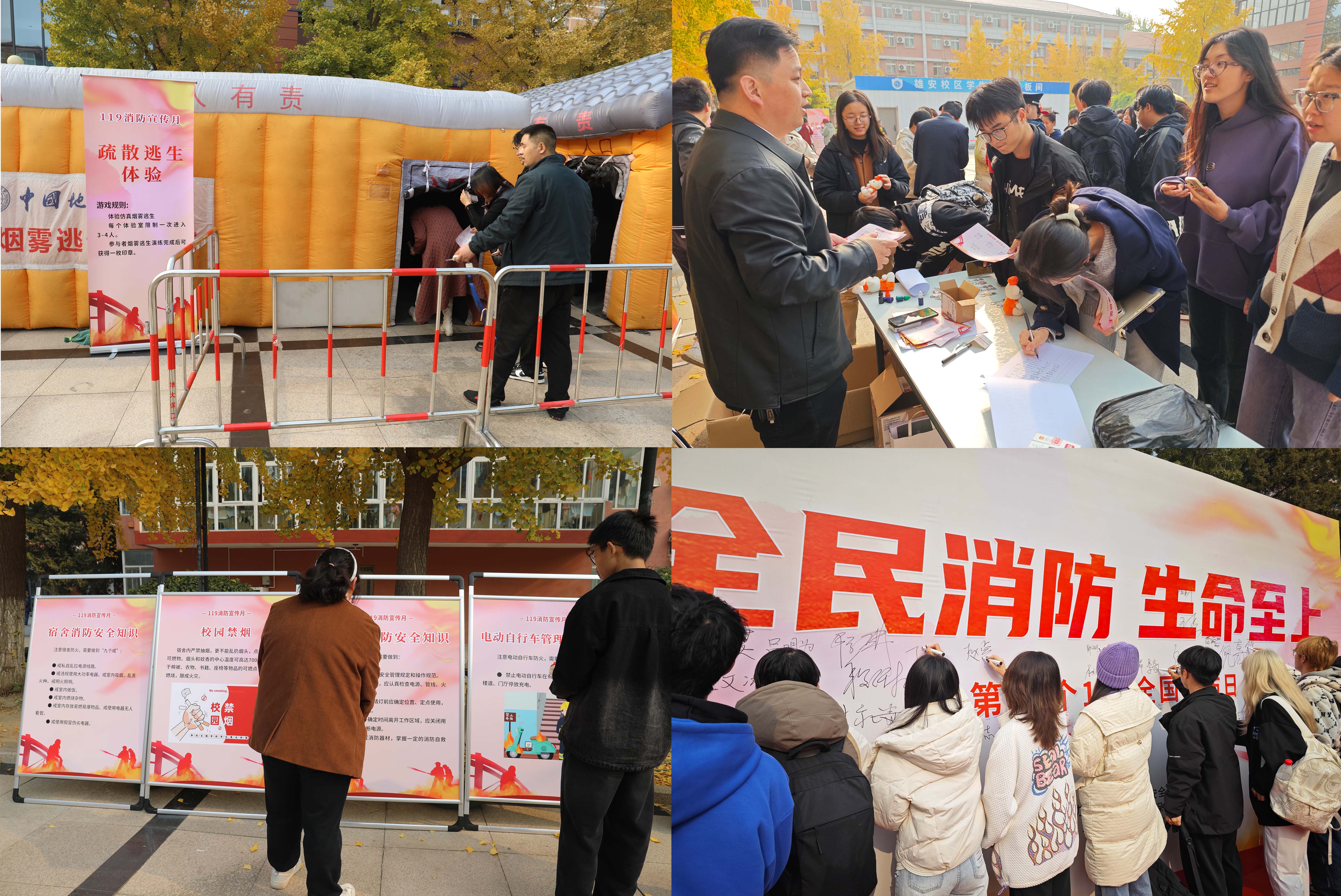 本次活动现场项目包含疏散逃生、模拟灭火器灭火、消防水带体验、消防服穿戴与消防知识抢答等活动,得到校内师生踊跃参与。其中在消防知识抢答环节,通过学到的消防知识获取精美小礼品,不仅让师生们对在学校里如何排除身边火灾隐患、配合消防安全工作有了更直观的了解,也进一步提升了应对突发火情的第一时间扑救及安全逃生能力。在活动最后,参与师生共同在“全民消防,生命至上”消防宣传月展板上签名,留下共同筑牢校园消防安全防线的郑重承诺。