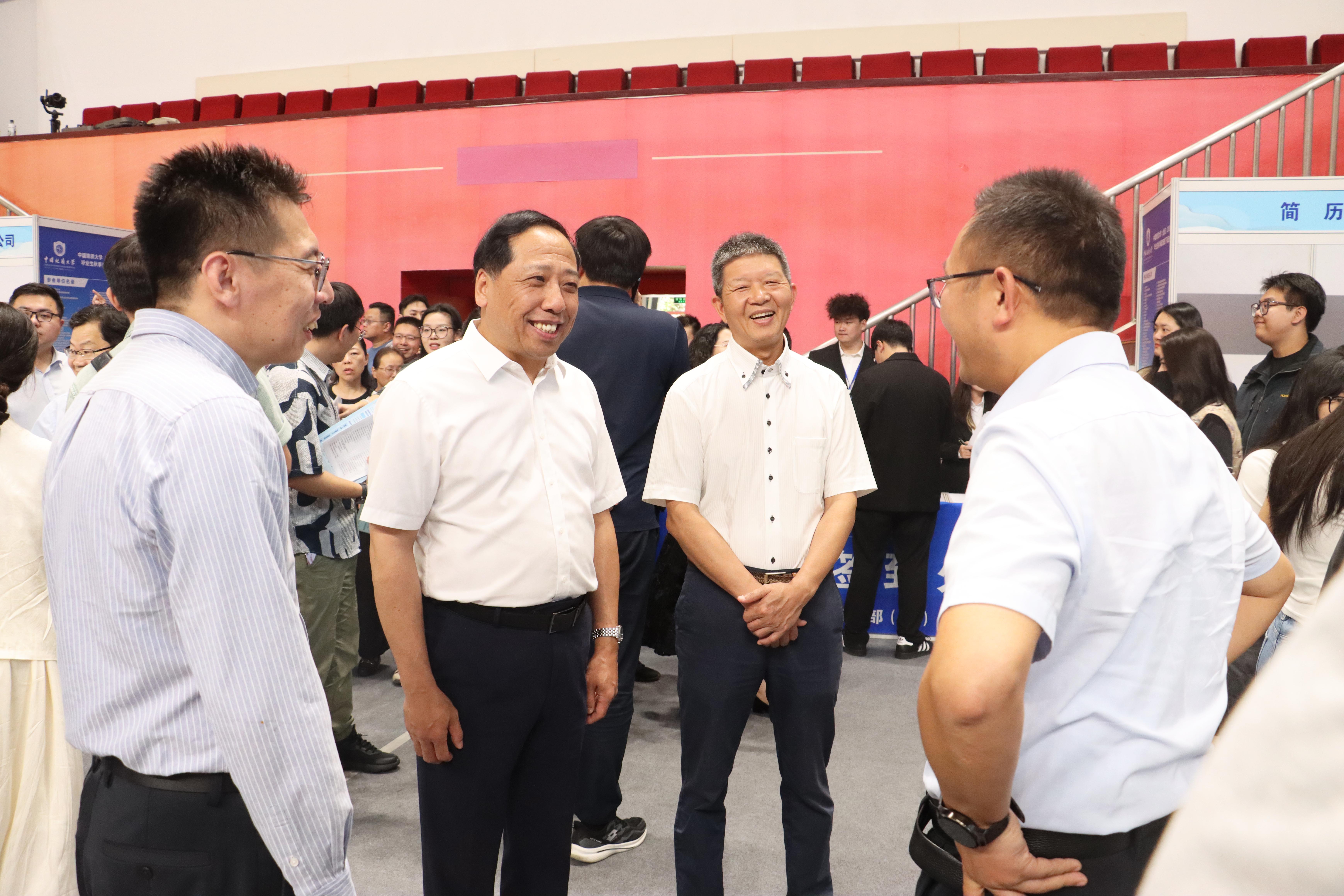 校长赵志丹、党委副书记林善园一行亲临双选会现场,开展访企拓岗调研活动。校领导一行先后走访了中国地质调查局廊坊自然资源调查中心、中国黄金集团地质有限公司、中国石化集团国际石油勘探开发有限公司等多家用人单位展位,与各单位代表深入交流,详细了解招聘岗位、人才需求以及对我校毕业生的评价反馈,认真听取用人单位对学校人才培养工作的意见建议。校领导对各用人单位长期以来对我校就业工作的支持和对我校毕业生的青睐表示衷心感谢,希望未来能进一步深化校企合作,共同培养符合行业发展需要的高素质人才。