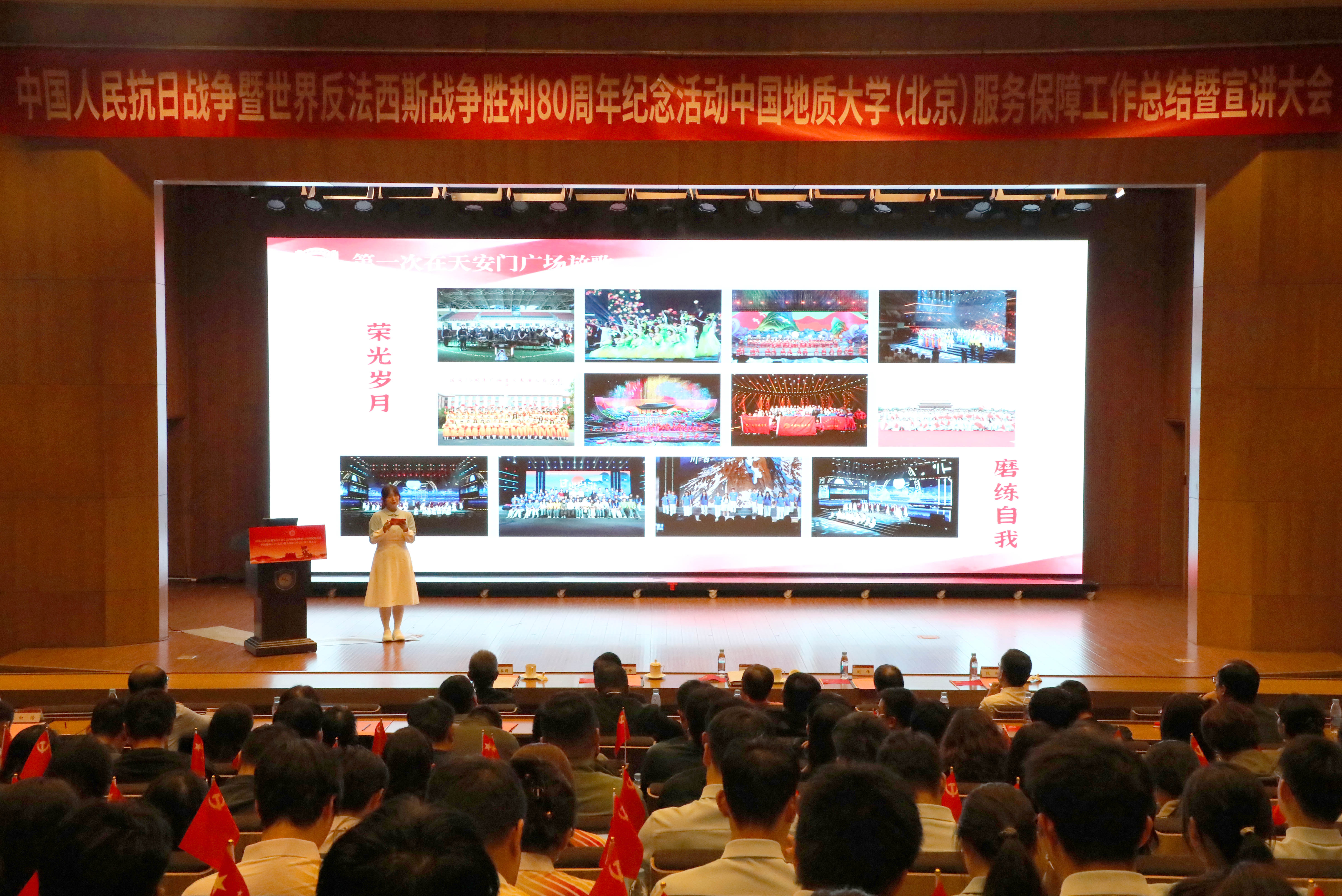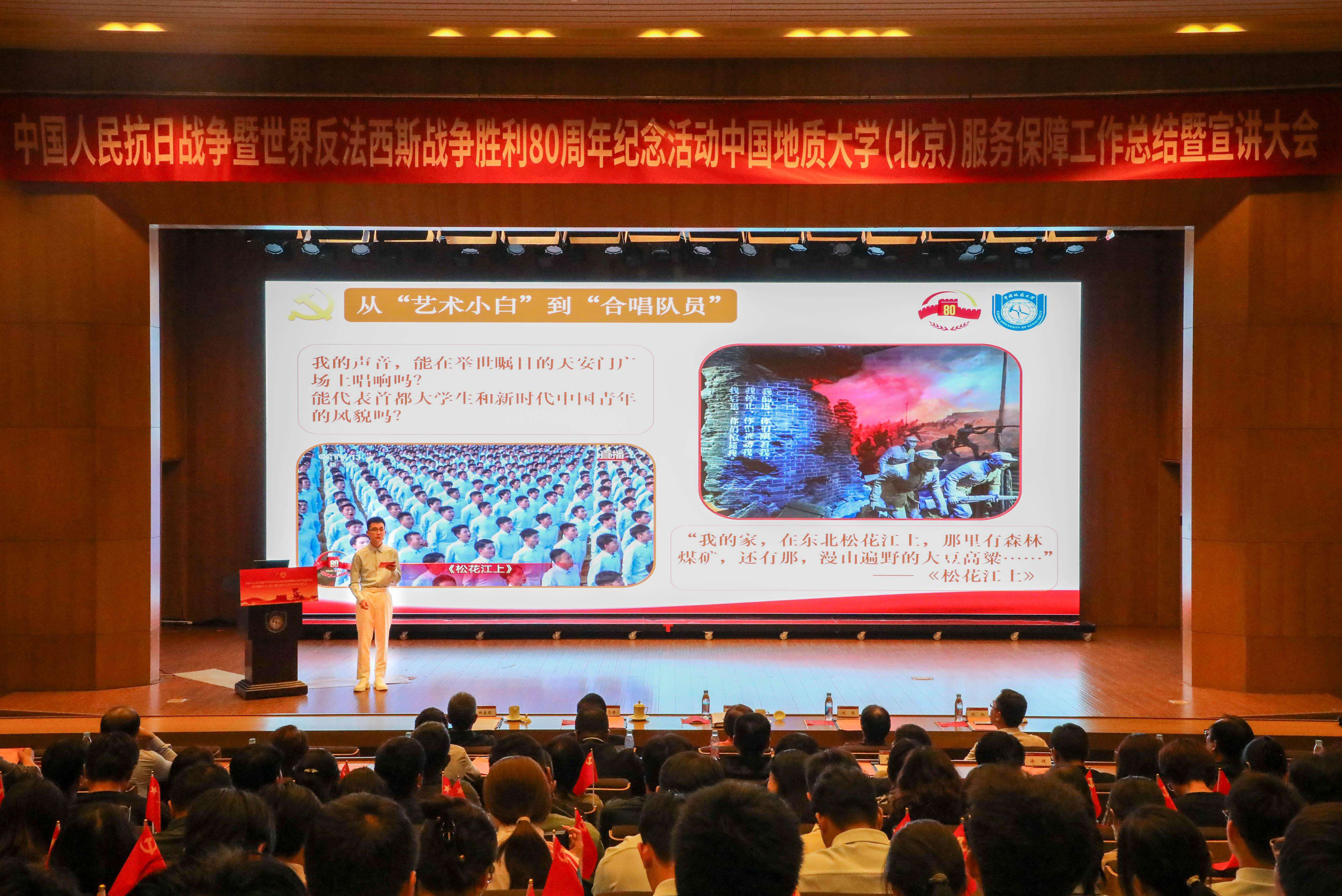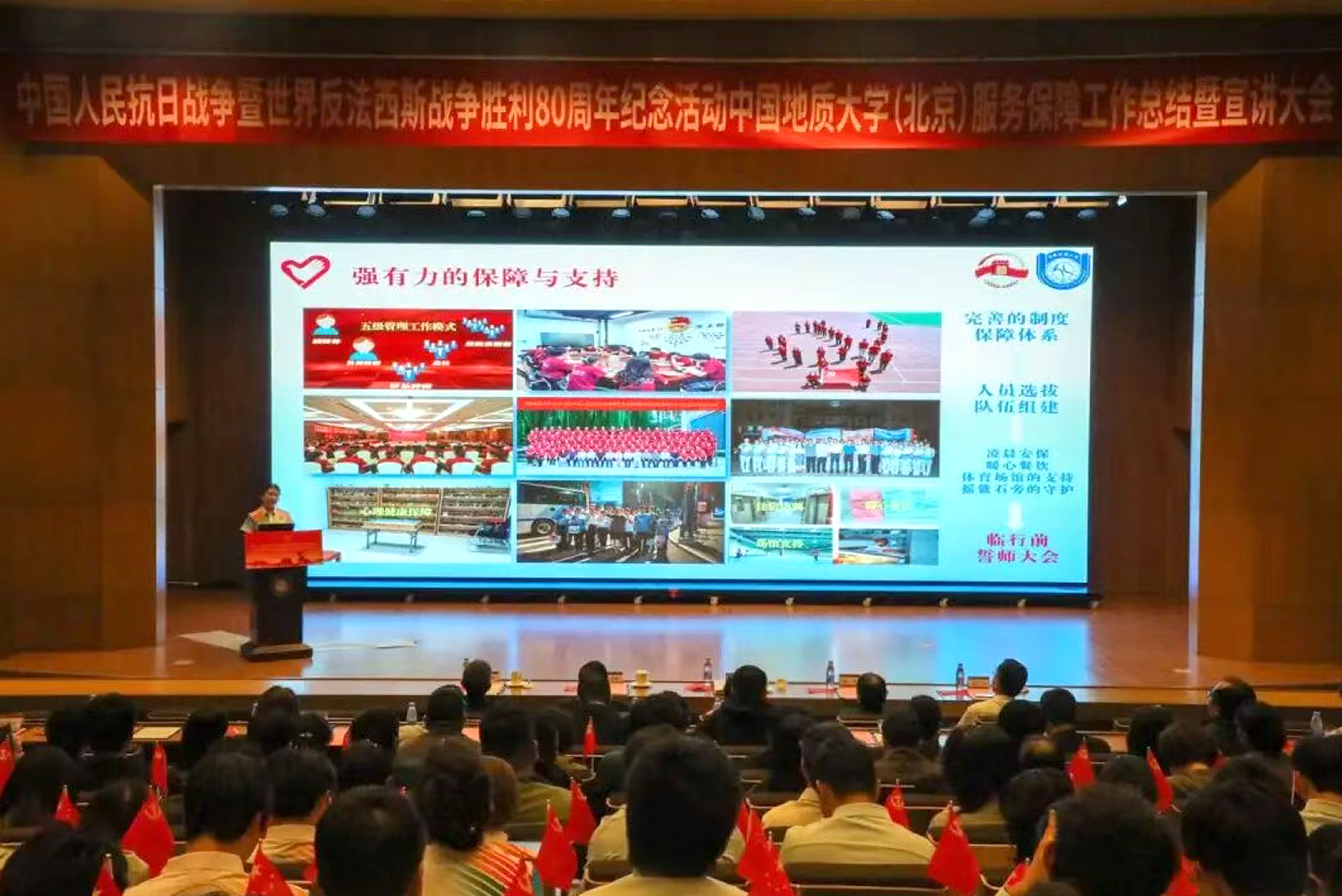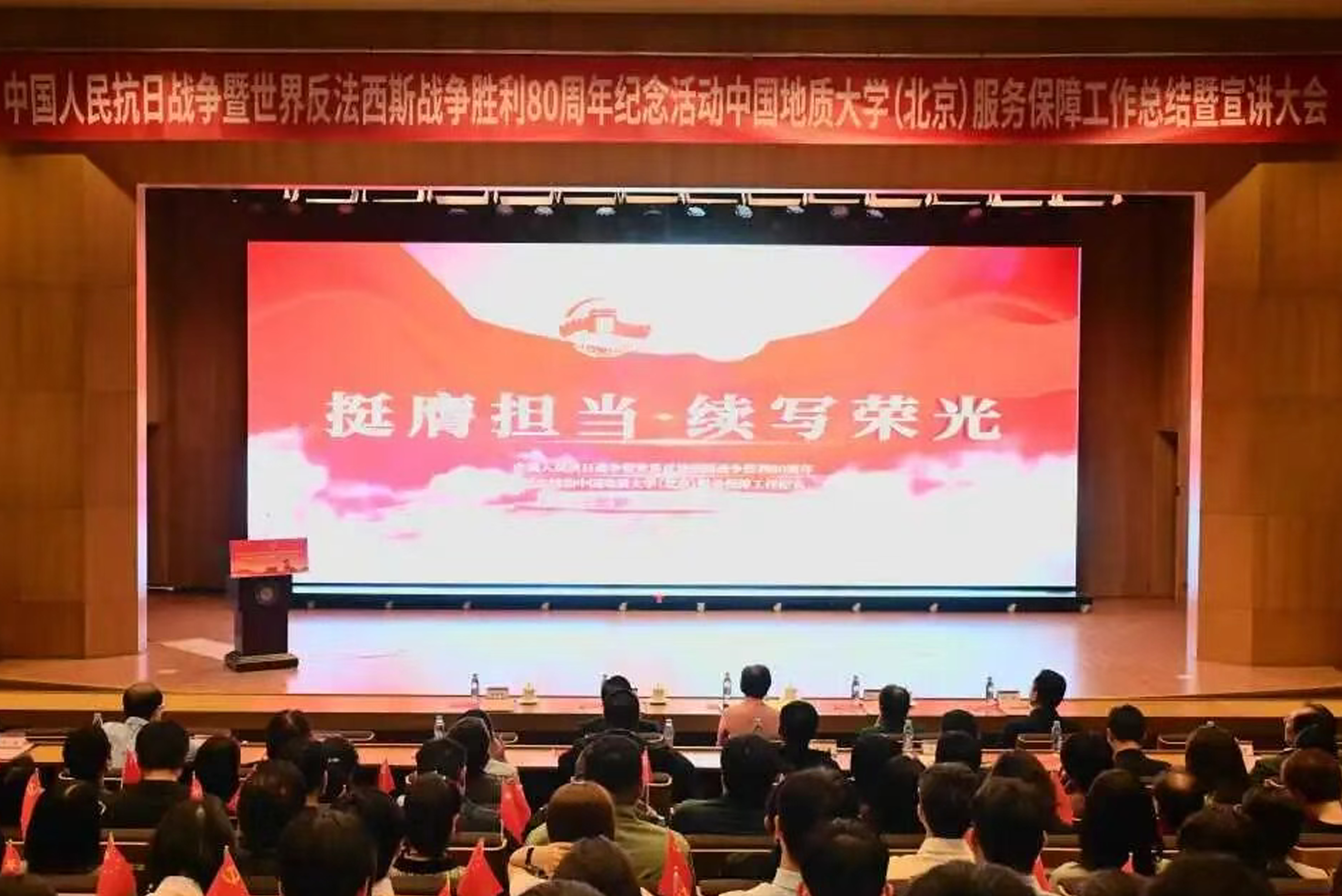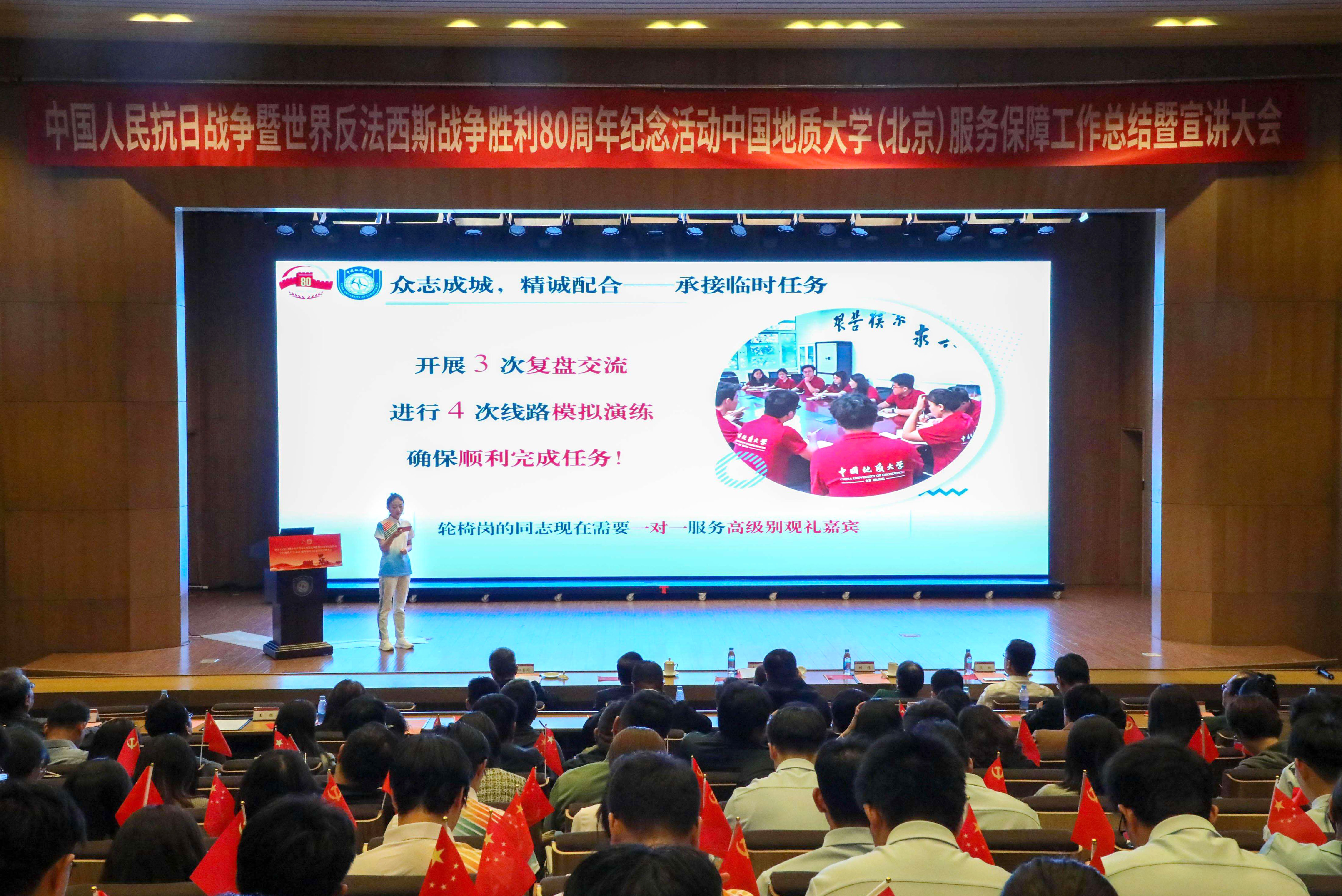 为深入学习贯彻习近平总书记重要讲话精神,落实中央纪念活动总结会议和北京市服务保障工作总结会议部署要求,全面总结学校参与纪念活动服务保障工作的经验做法,汲取纪念活动蕴含的精神力量,进一步弘扬伟大抗战精神,10月14日下午,我校隆重召开中国人民抗日战争暨世界反法西斯战争胜利80周年纪念活动服务保障工作总结暨宣讲大会。校党委书记雷涯邻,校长赵志丹,党委副书记、纪委书记刘伟,副校长段翔出席会议,校党委副书记林善园主持会议。