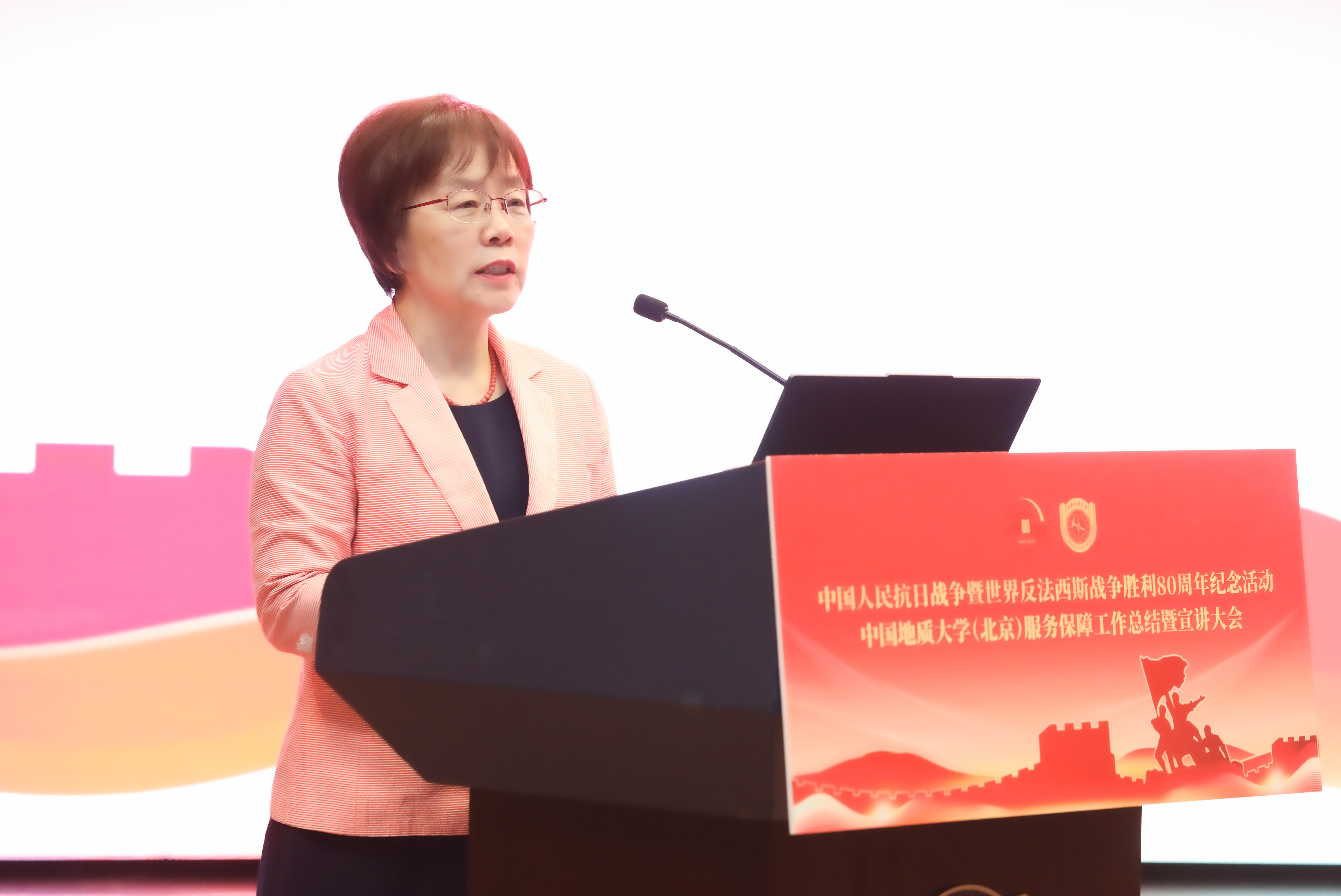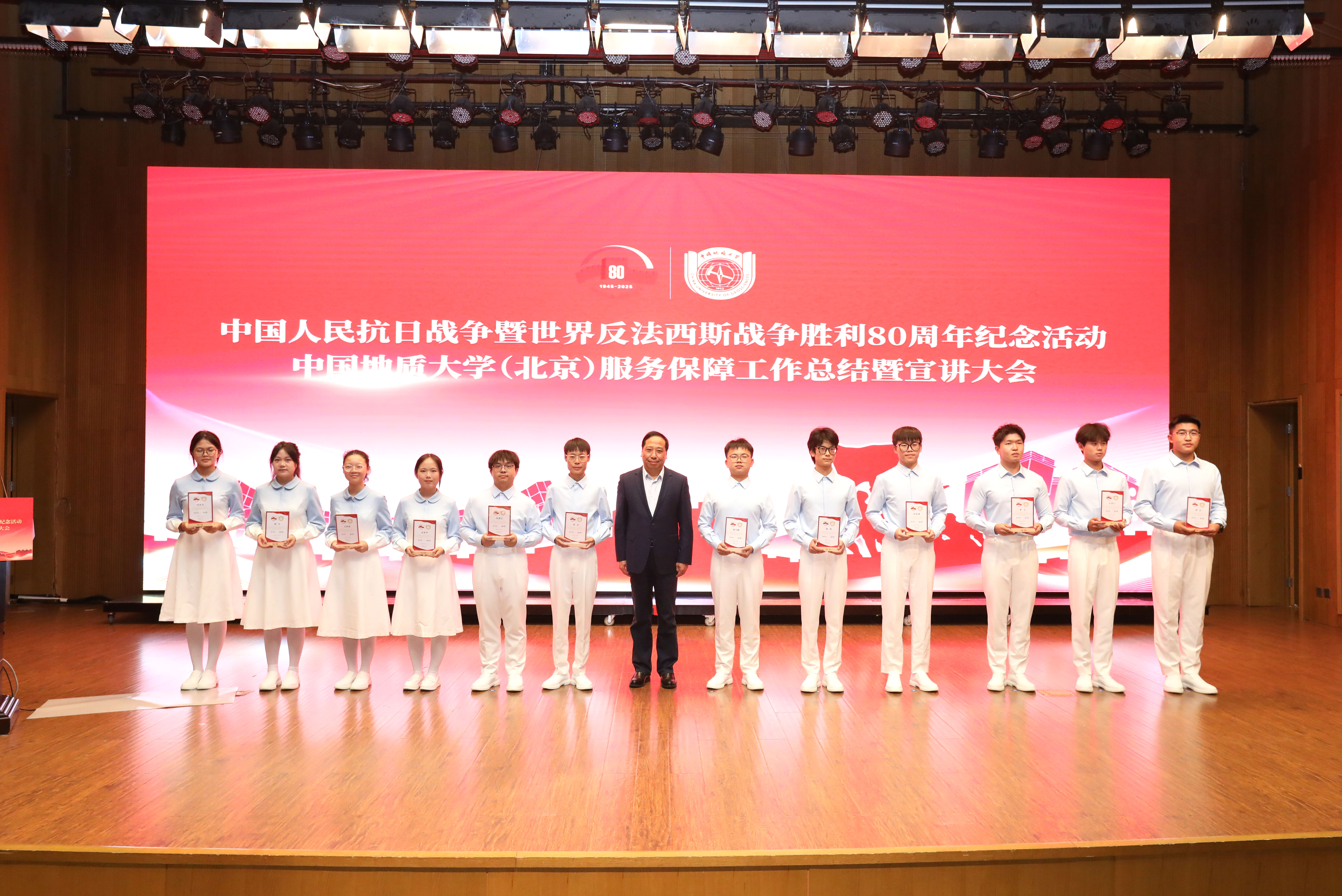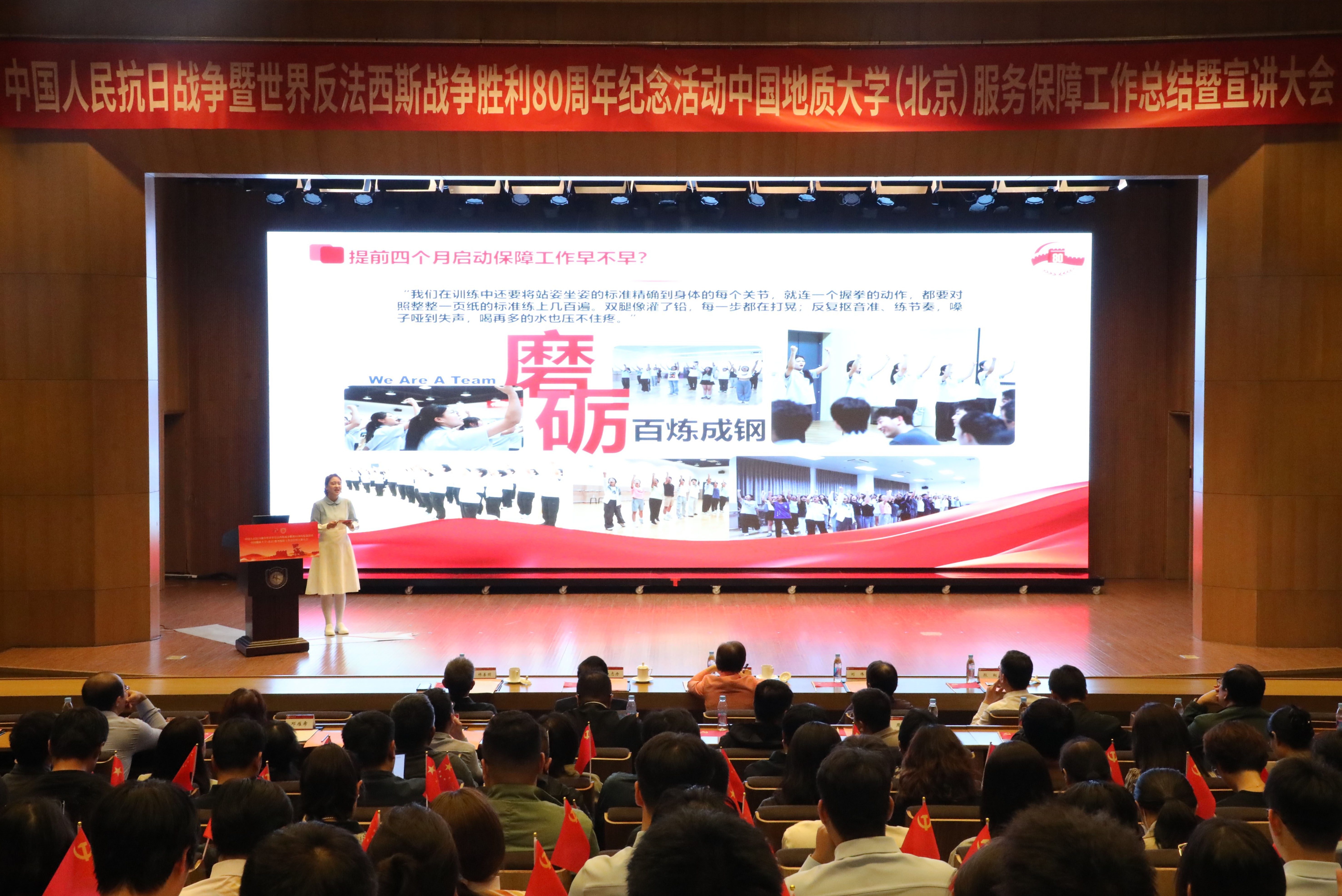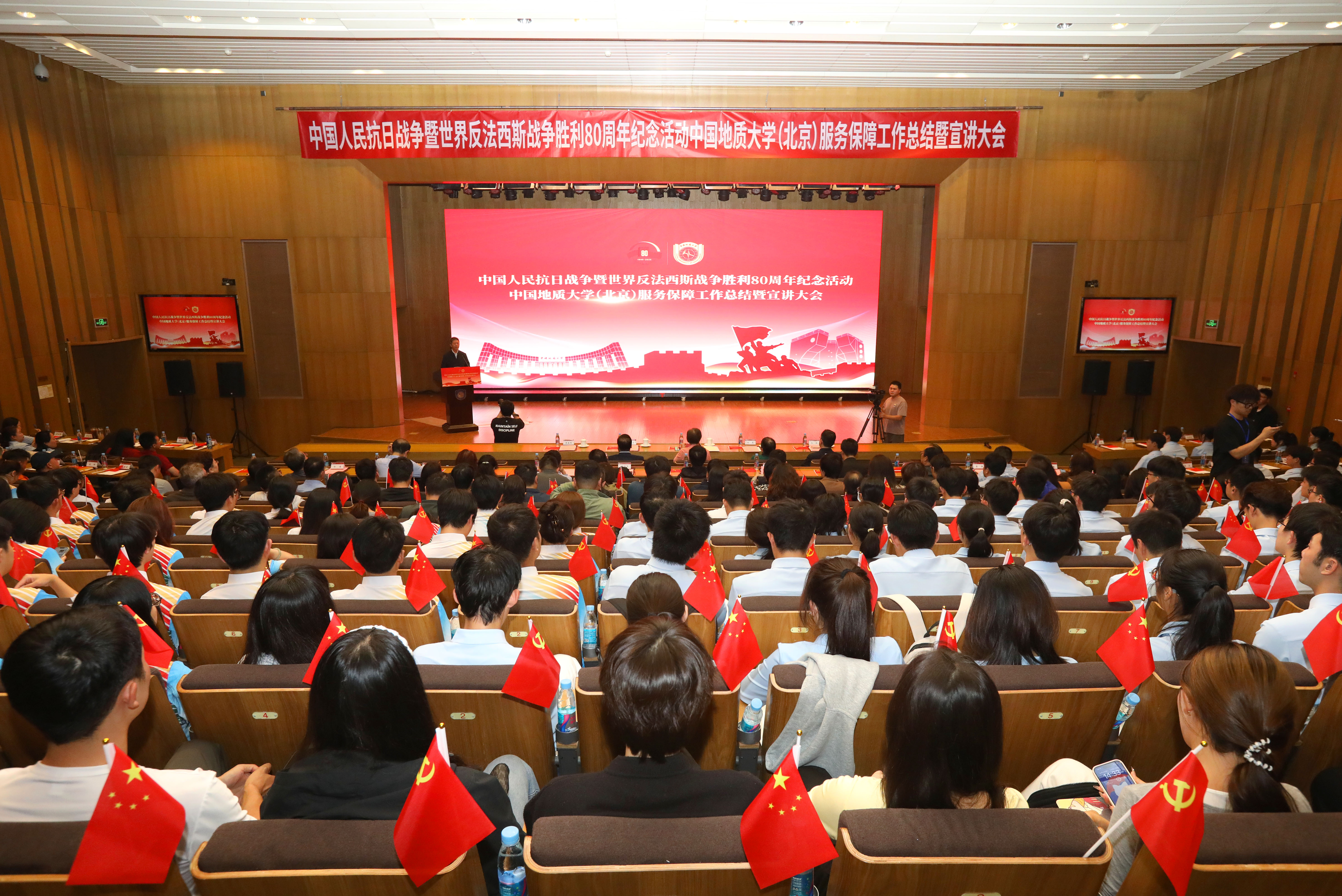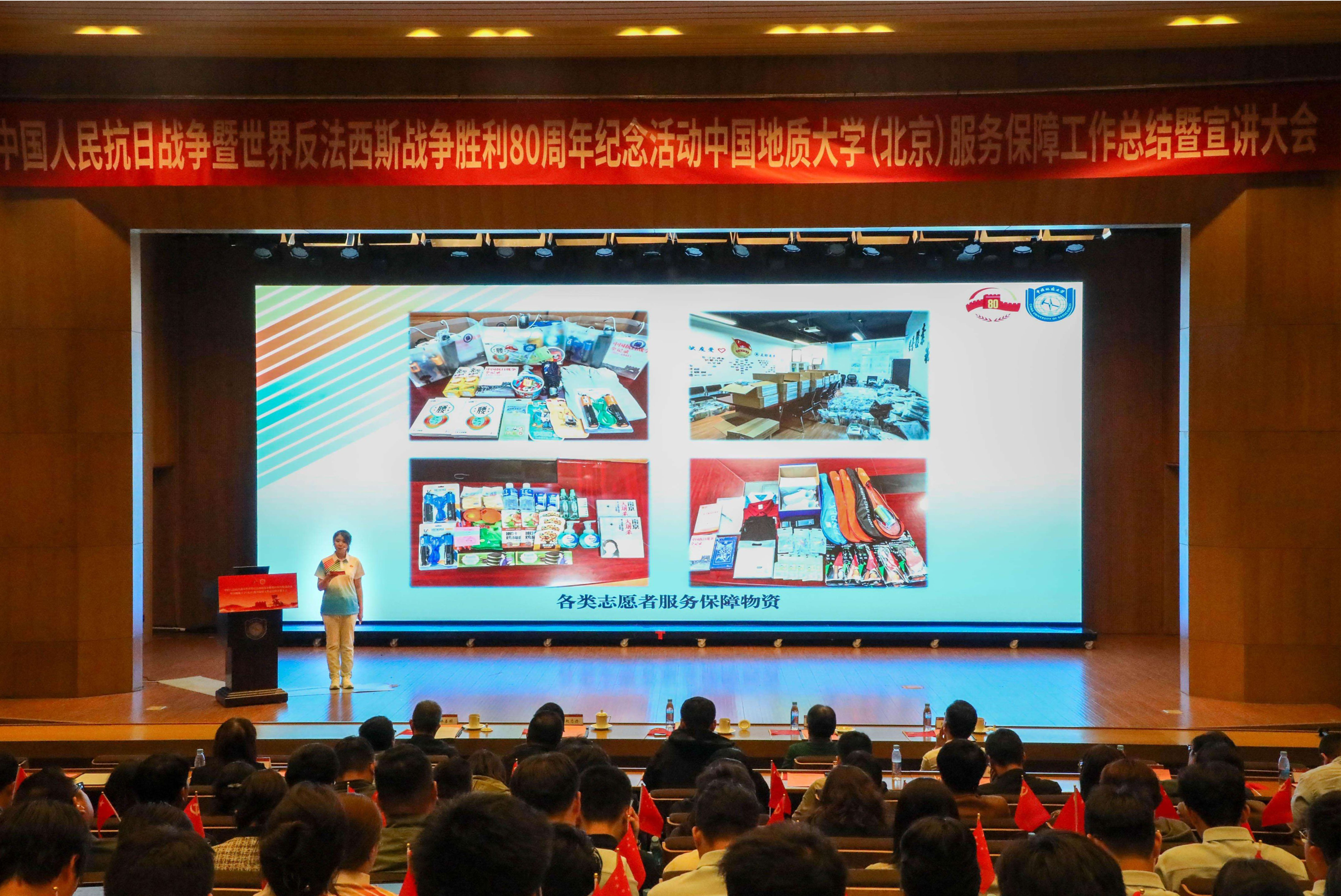 为深入学习贯彻习近平总书记重要讲话精神,落实中央纪念活动总结会议和北京市服务保障工作总结会议部署要求,全面总结学校参与纪念活动服务保障工作的经验做法,汲取纪念活动蕴含的精神力量,进一步弘扬伟大抗战精神,10月14日下午,我校隆重召开中国人民抗日战争暨世界反法西斯战争胜利80周年纪念活动服务保障工作总结暨宣讲大会。校党委书记雷涯邻,校长赵志丹,党委副书记、纪委书记刘伟,副校长段翔出席会议,校党委副书记林善园主持会议。