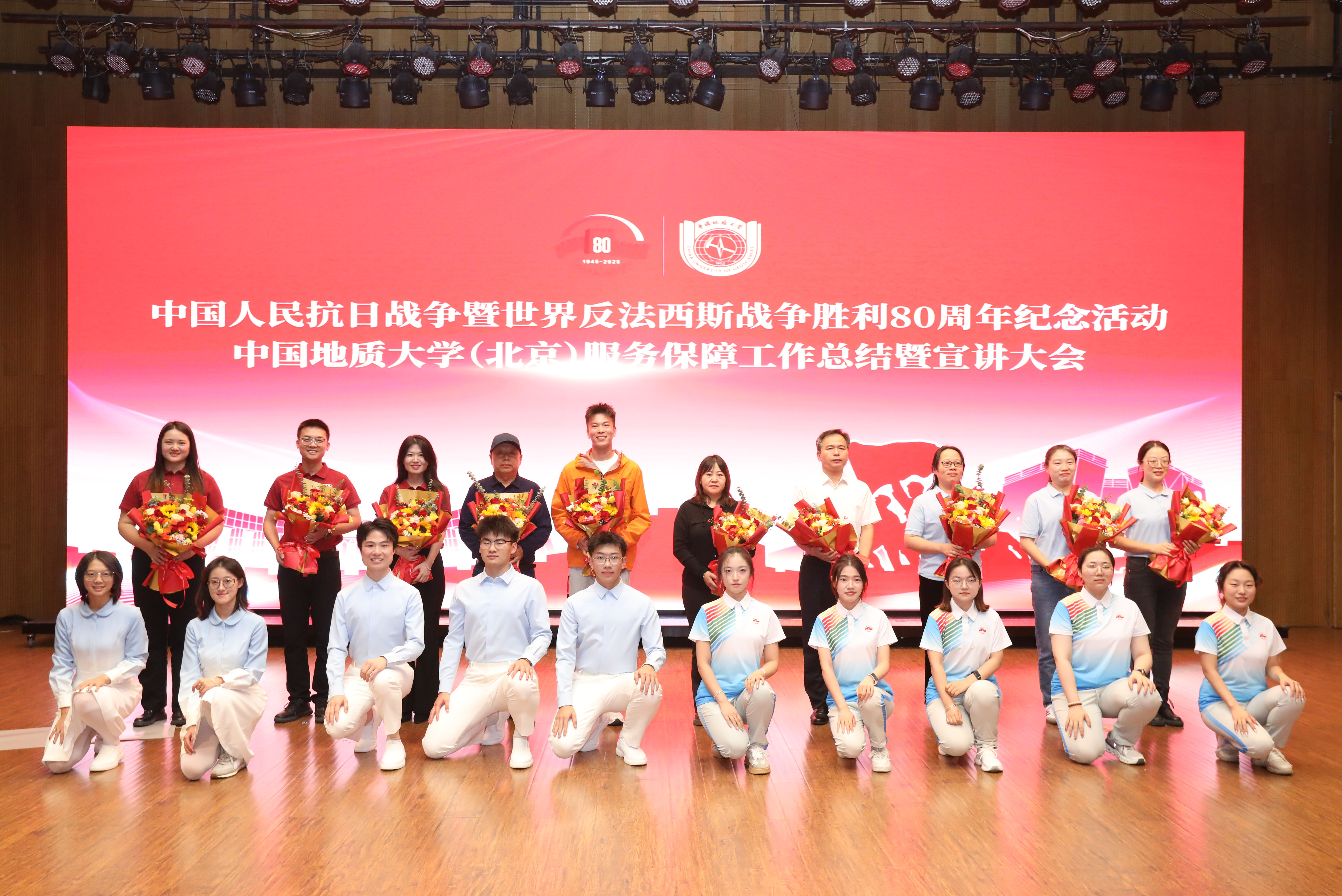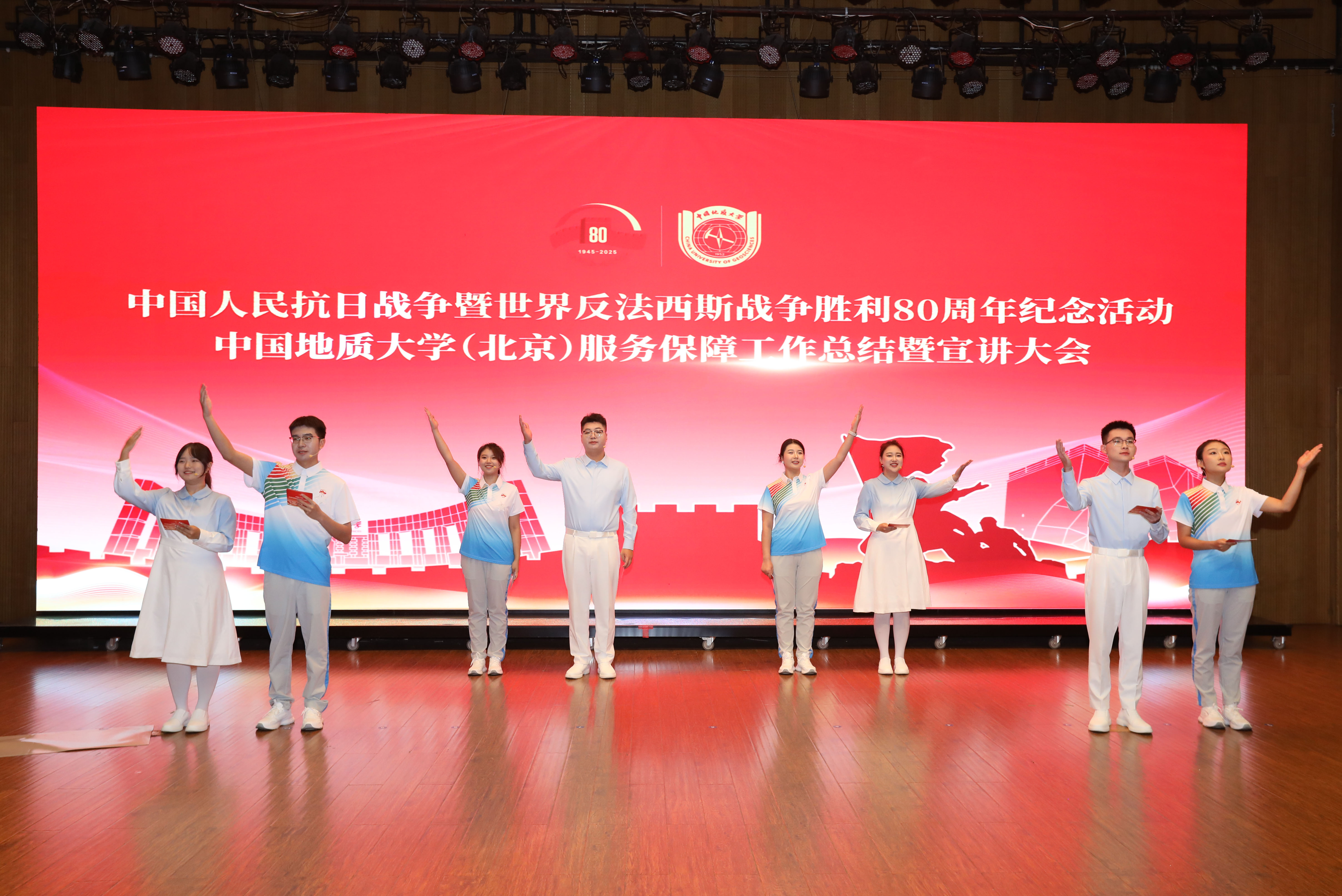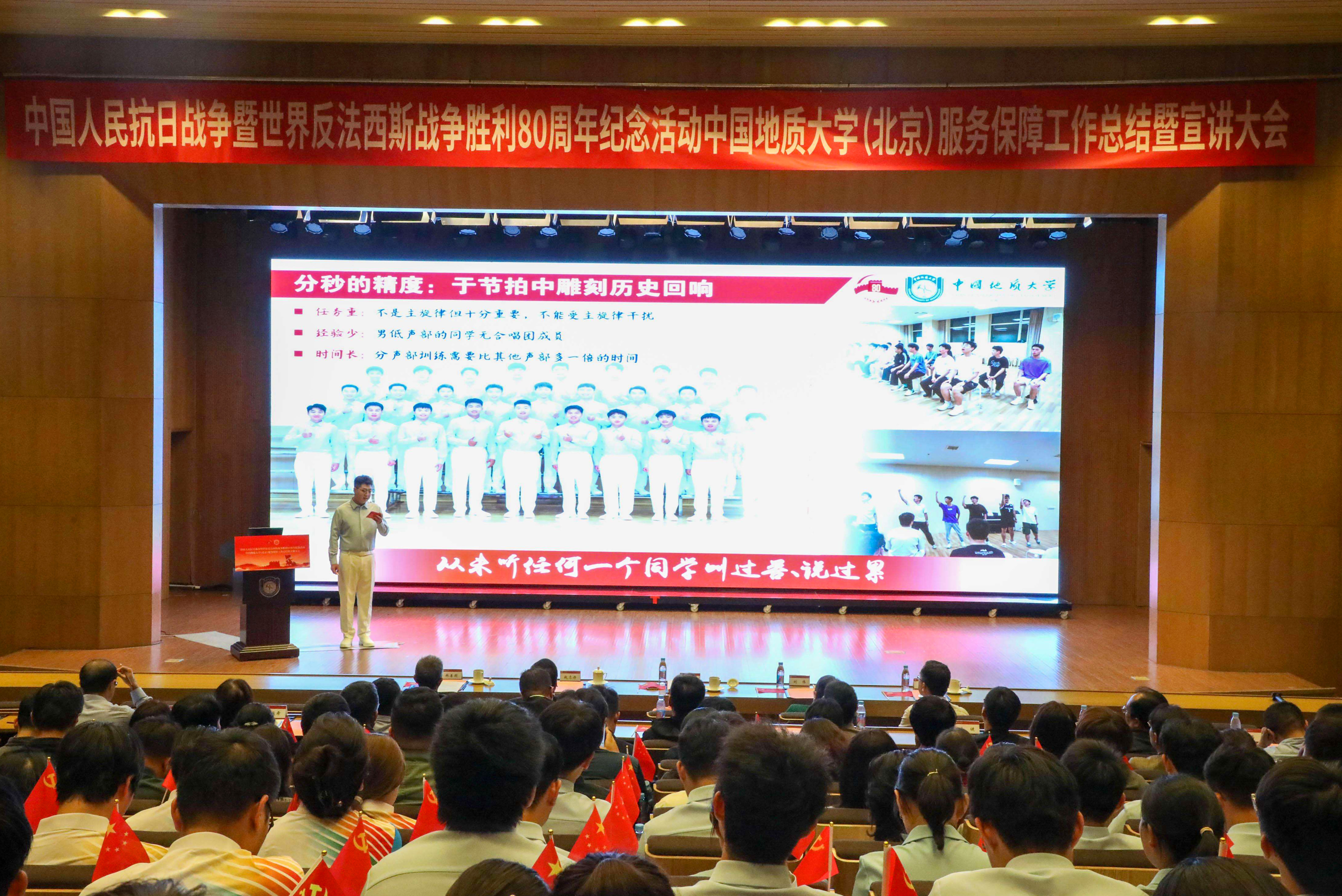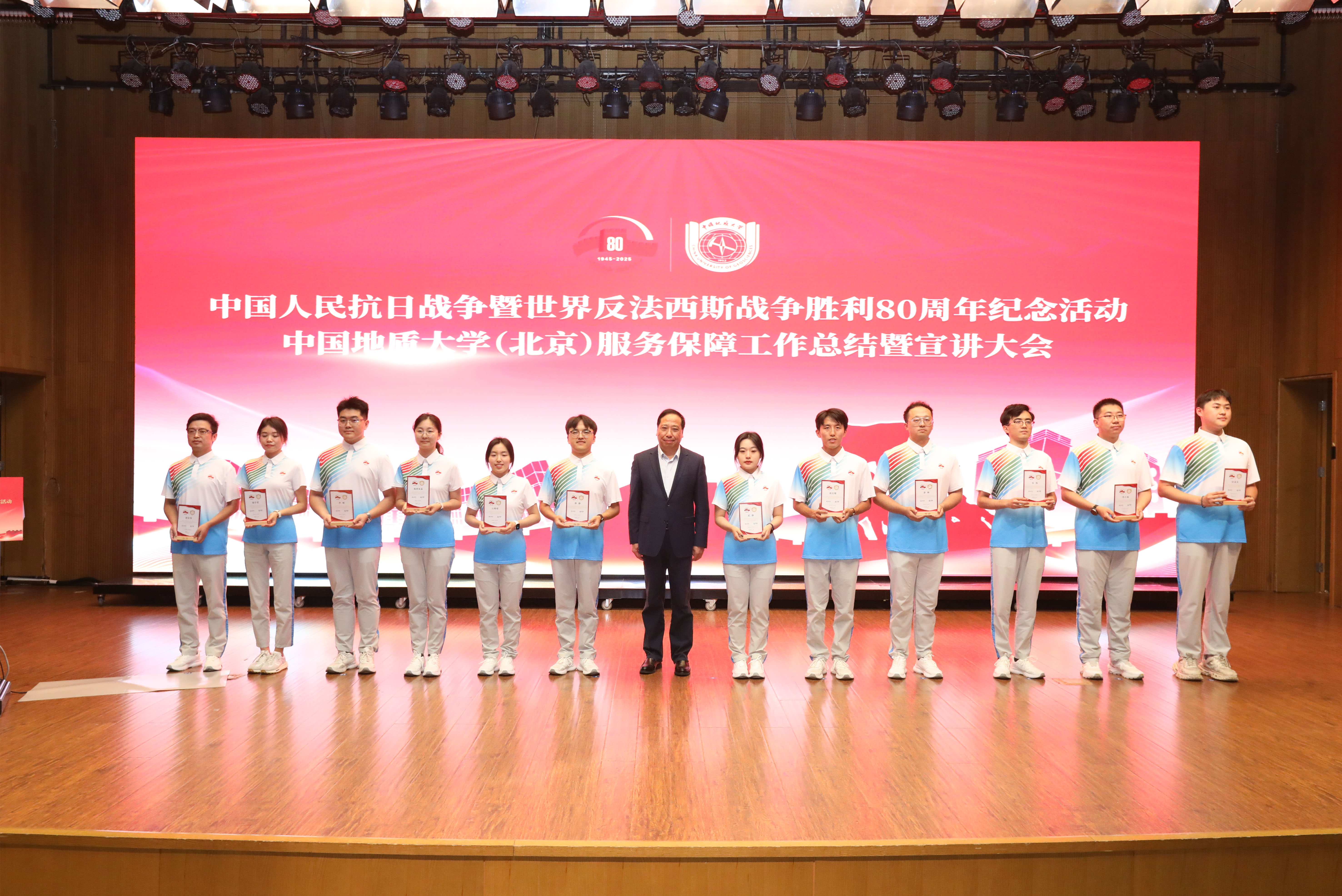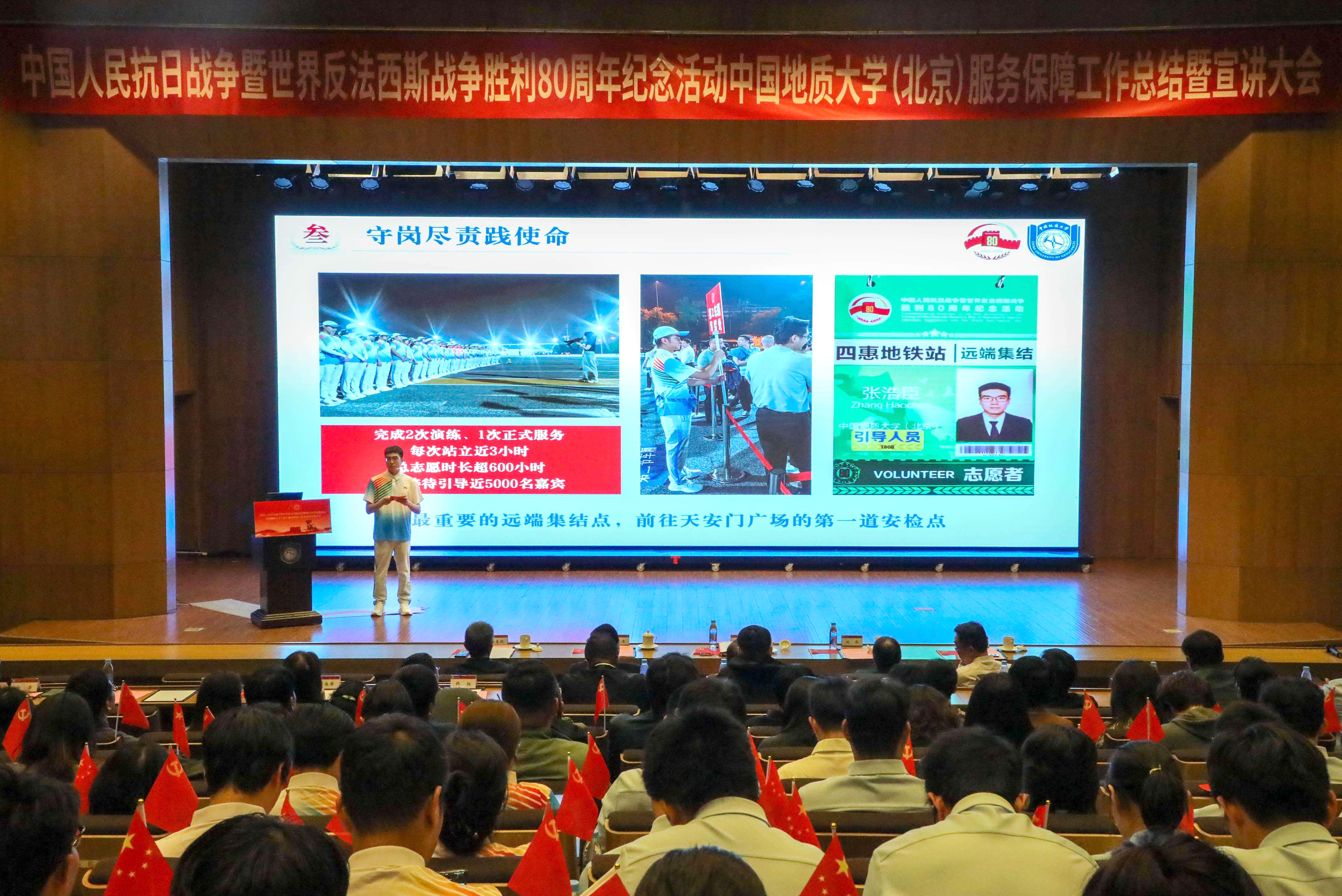 伴随着庄严的国歌声,大会正式拉开帷幕。全场共同观看《服务保障重大活动纪实视频》,回顾了我校在纪念中国人民抗日战争暨世界反法西斯战争胜利80周年大会中的责任担当。我校共选派83名师生参与广场合唱、113名师生参与志愿服务、1名辅导员借调团市委重大活动志愿者指挥部、1名党员干部受上级专班指派参与模拟演练。全体参与者挺膺担当、不辱使命,历经4个月的精心准备、密集训练和倾情奉献,圆满完成了纪念活动服务保障任务,向党和国家提交了出色的地大答卷。
