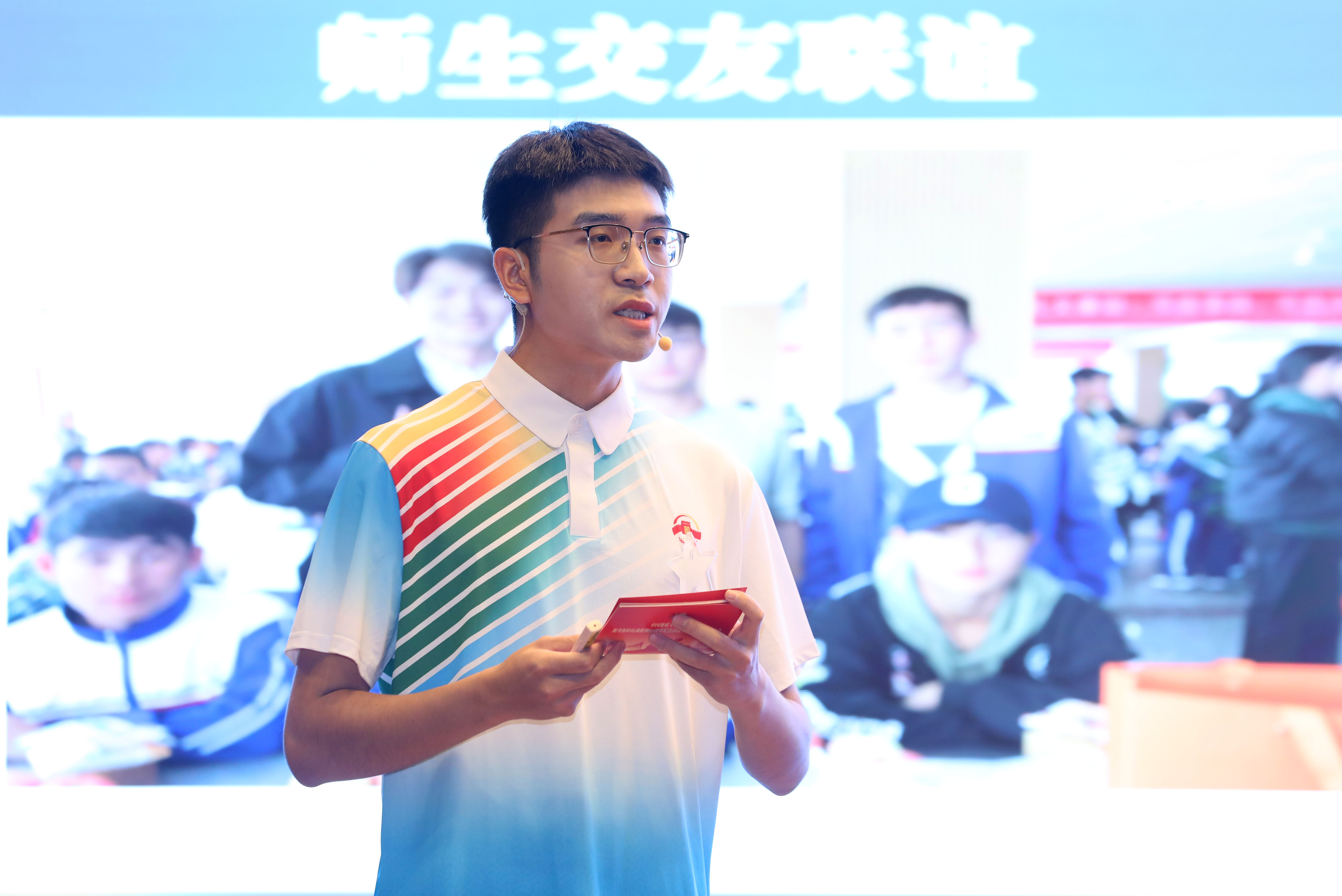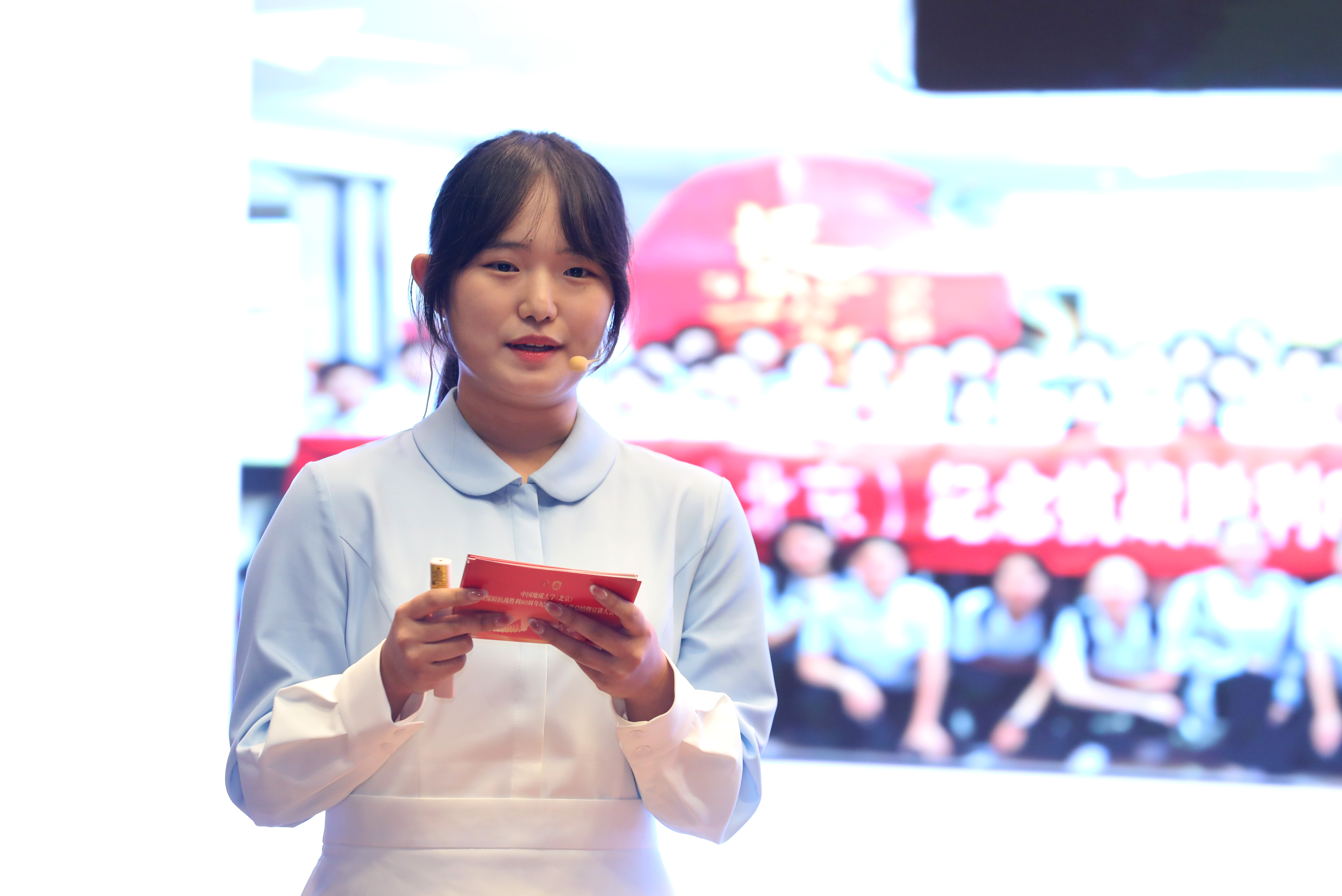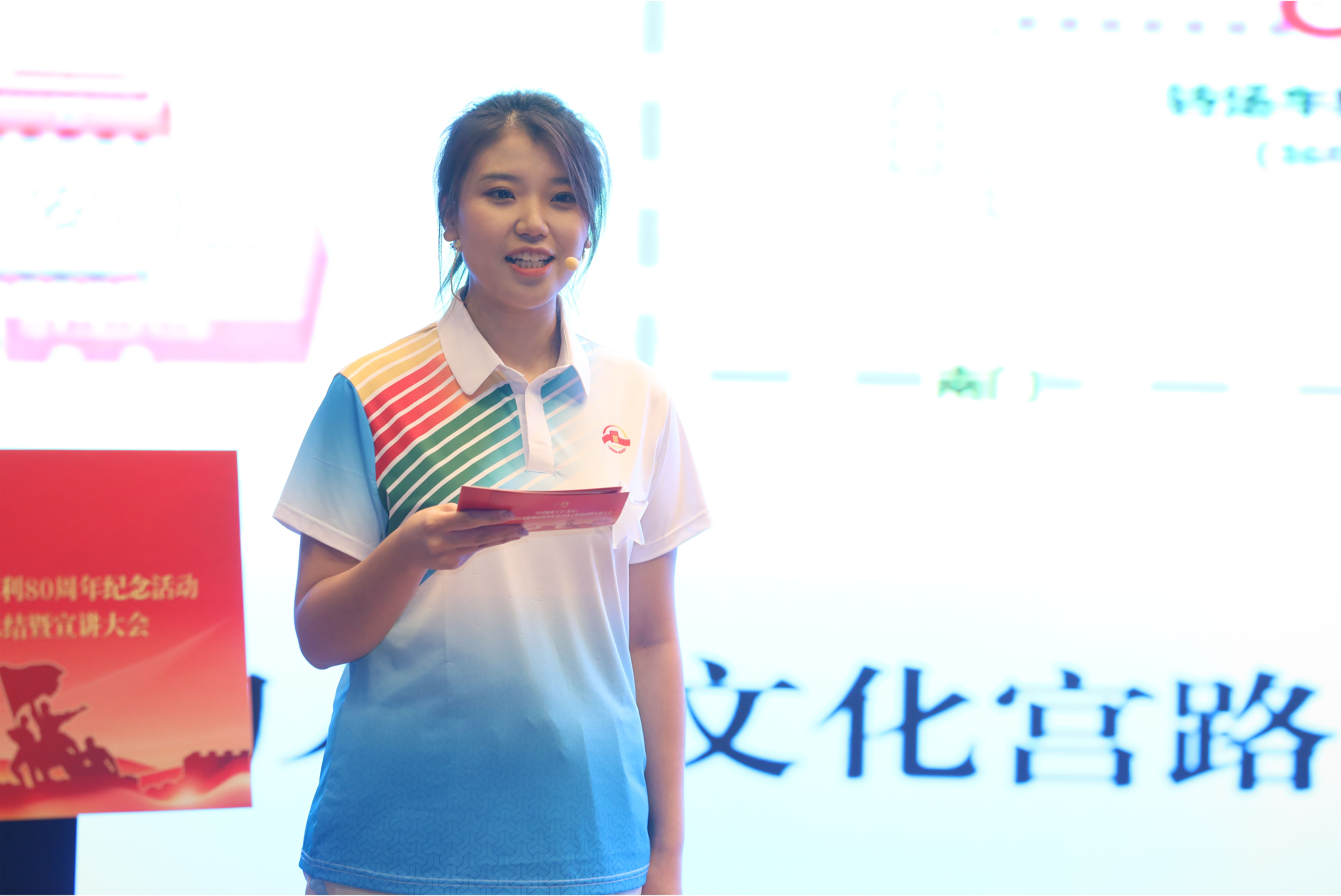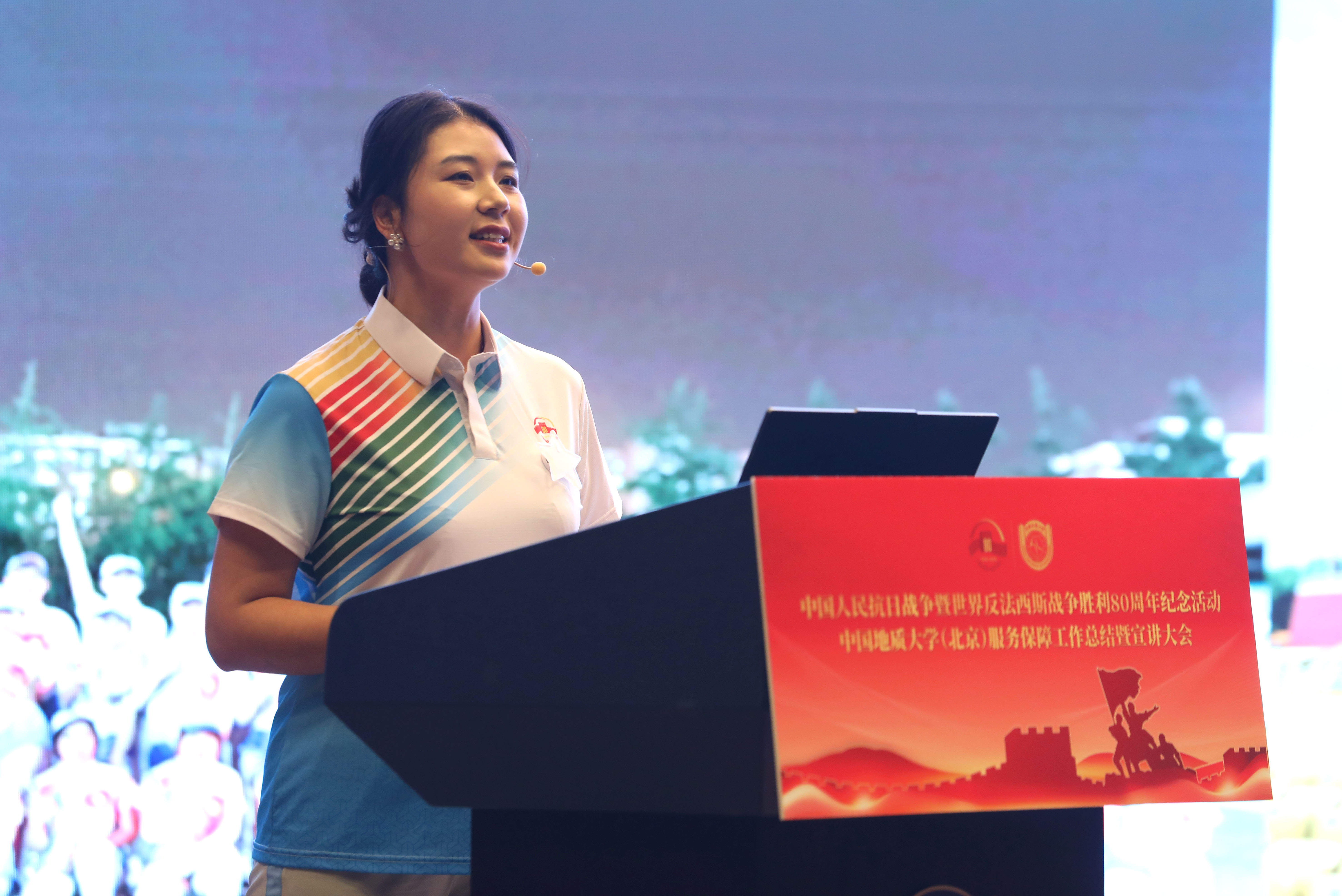 志愿者带队教师郭利娜以《以青春之手 书写时代答卷》为题,结合她作为带队教师的深切感悟,深情回顾了113名地大志愿者如何通过专业培训和细致服务来传递温暖与敬意。她特别阐述了一对一陪同抗战老兵与英烈后代这一特殊任务,生动展现新时代青年与历史对话、传承抗战精神的赤诚之心。