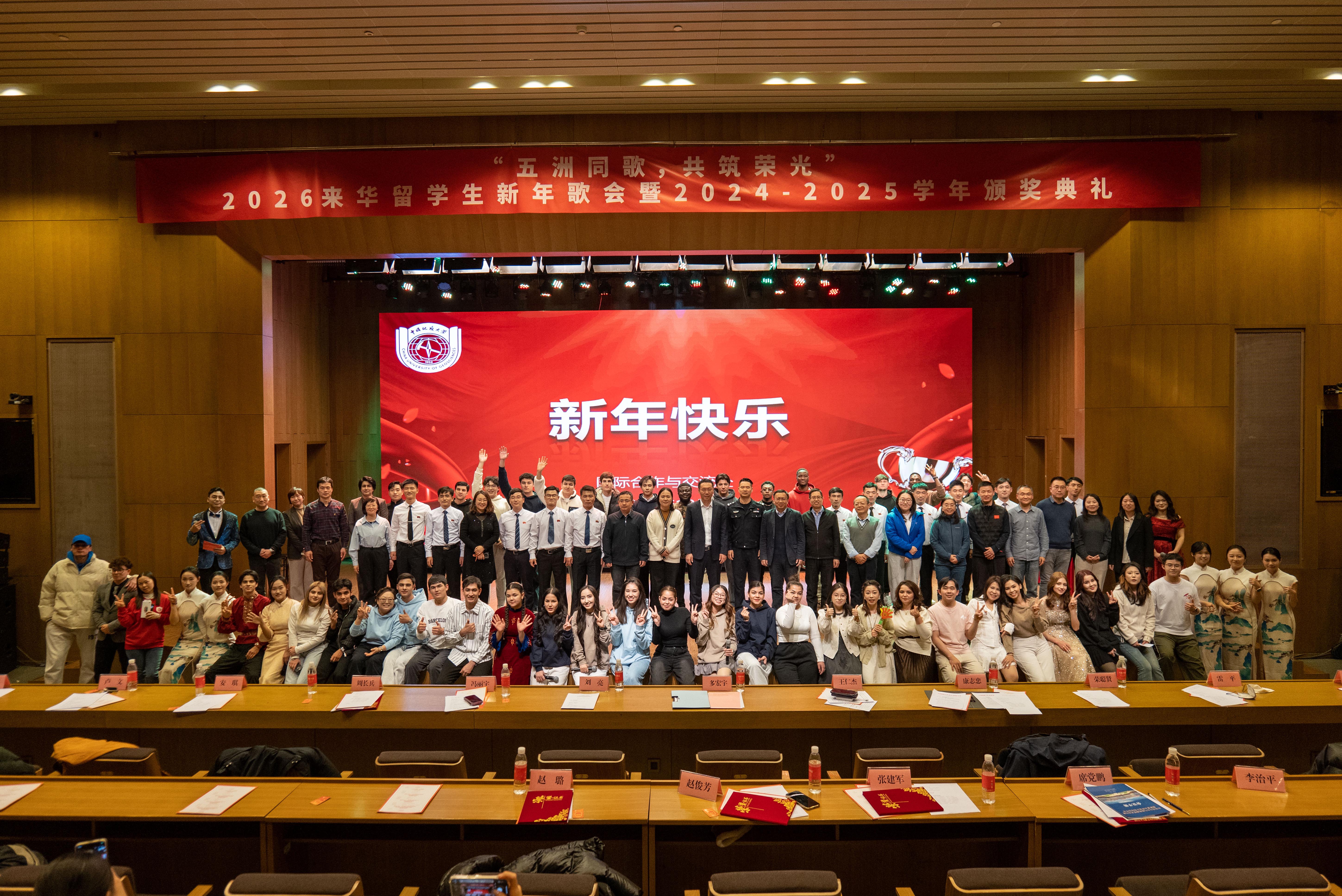 12月12日,“五洲同歌,共筑荣光”2026来华留学生新年歌会暨2024-2025学年颁奖典礼举办。校党委副书记多宏宇、北京市公安局海淀分局出入境管理大队王仁杰、中关村街道华清园社区党委副书记冯丽宇出席活动。