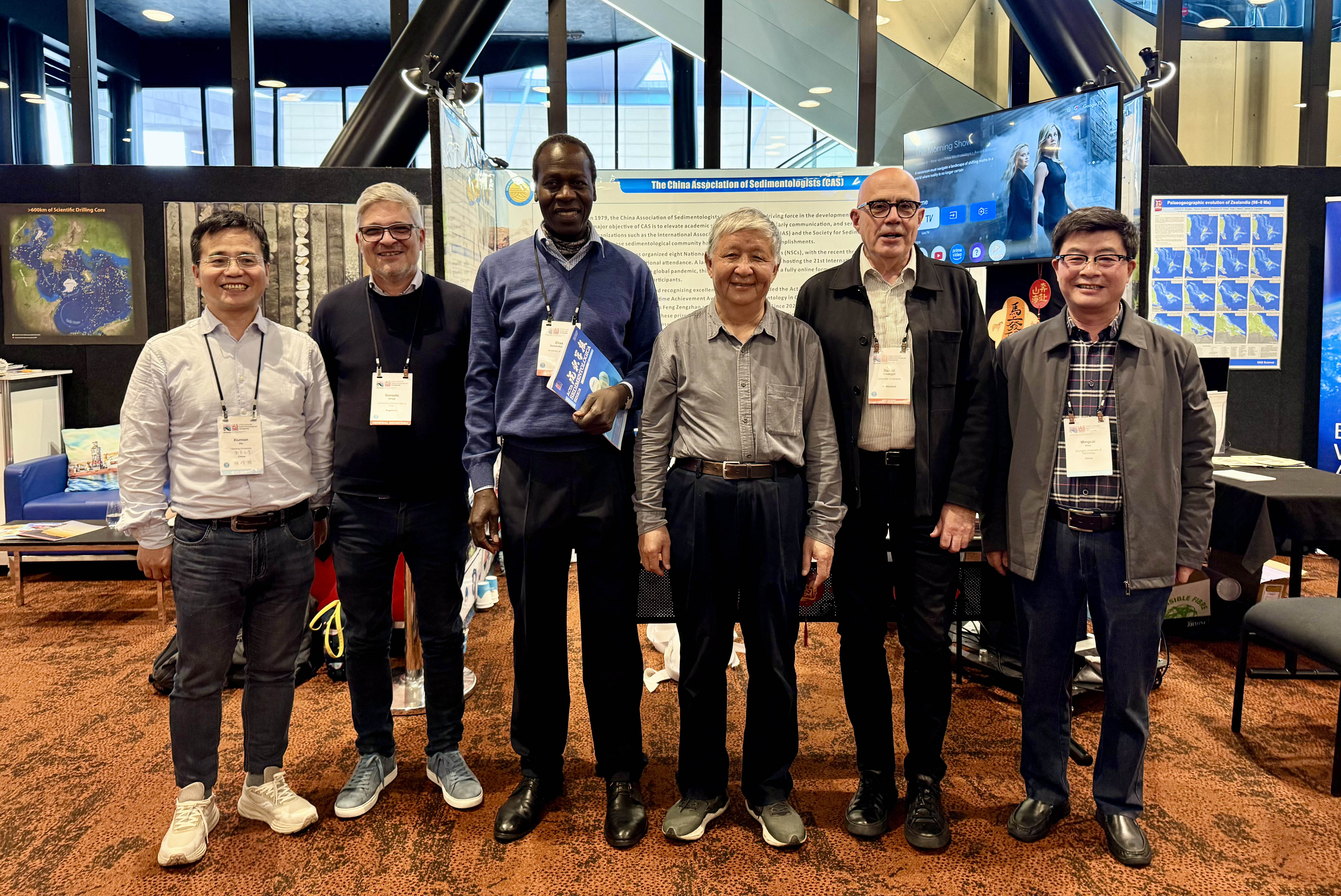 王成善院士(左四)与IAS主席(Daniel,左五)、换届新主席(Elias,左三)在中国沉积学专委会展台前合影