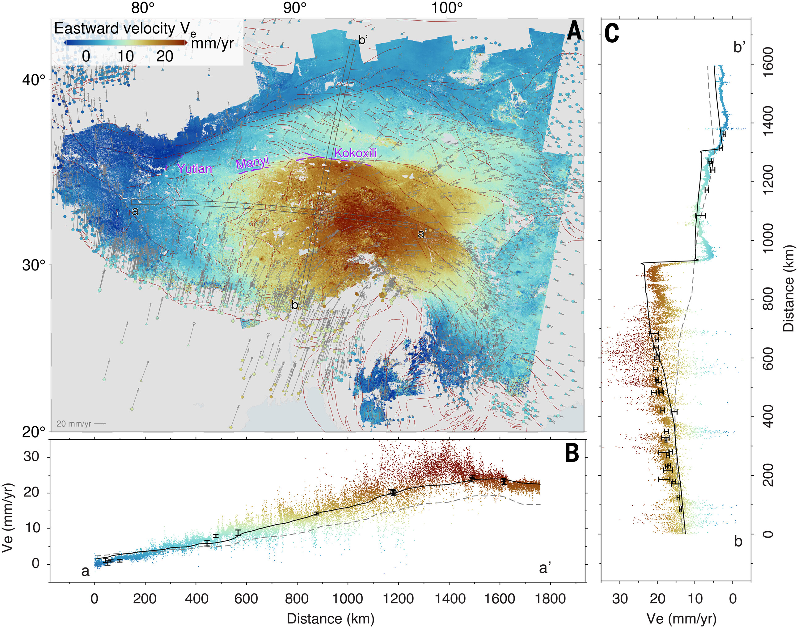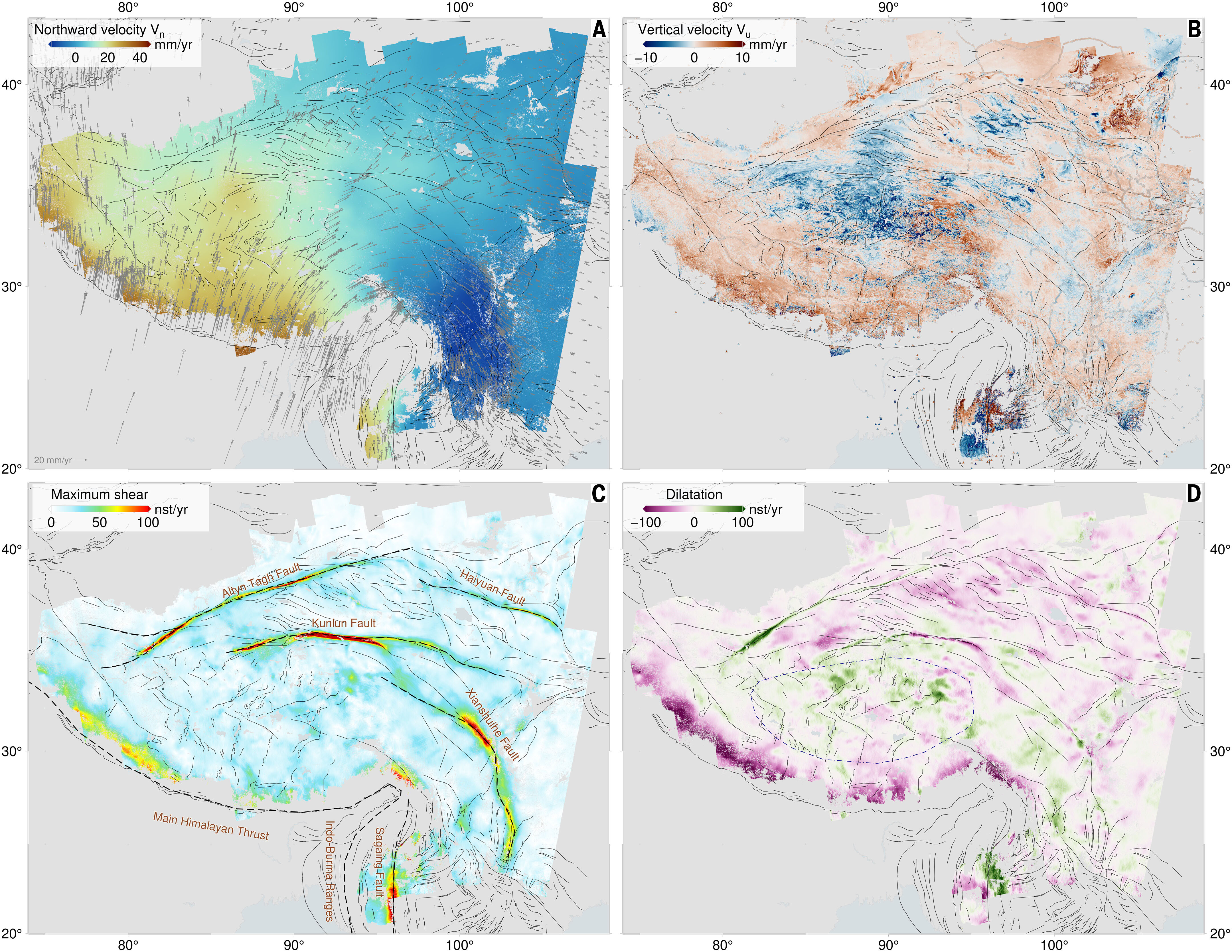 1月29日,我校特聘教授Gregory A. Houseman院士团队的研究成果《High-resolution geodetic velocities reveal role of weak faults in deformation of Tibetan Plateau》(《高分辨率大地测量速度场揭示弱断裂在青藏高原地壳形变中的作用》),在国际顶尖学术期刊《Science》发表。论文由英国利兹大学、中国地质大学(北京)、英国埃克塞特大学、澳大利亚蒙纳士大学、英国爱丁堡大学、英国牛津大学和美国哥伦比亚大学等多所机构的科研人员合作完成。