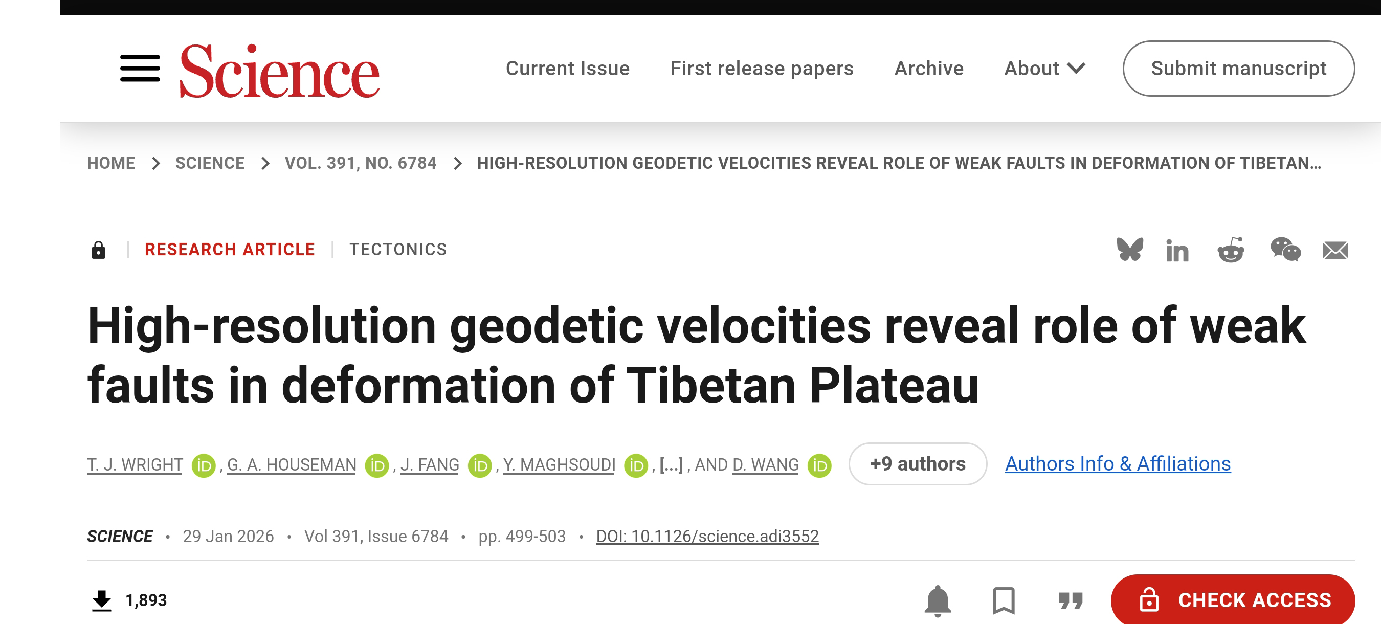 上述研究成果发表于国际顶刊《Science》上:T. J. Wright*, G. A. Houseman, J. Fang*, Y. Maghsoudi, A. J. Hooper, J. R. Elliott, L. Evans, M. Lazecky, Q. Ou, B. E. Parsons, J. C. Rollins, L. Shen, H. Wang, D. Wang. High-resolution geodetic velocities reveal role of weak faults in deformation of Tibetan Plateau. Science, 2026, 391(6784).