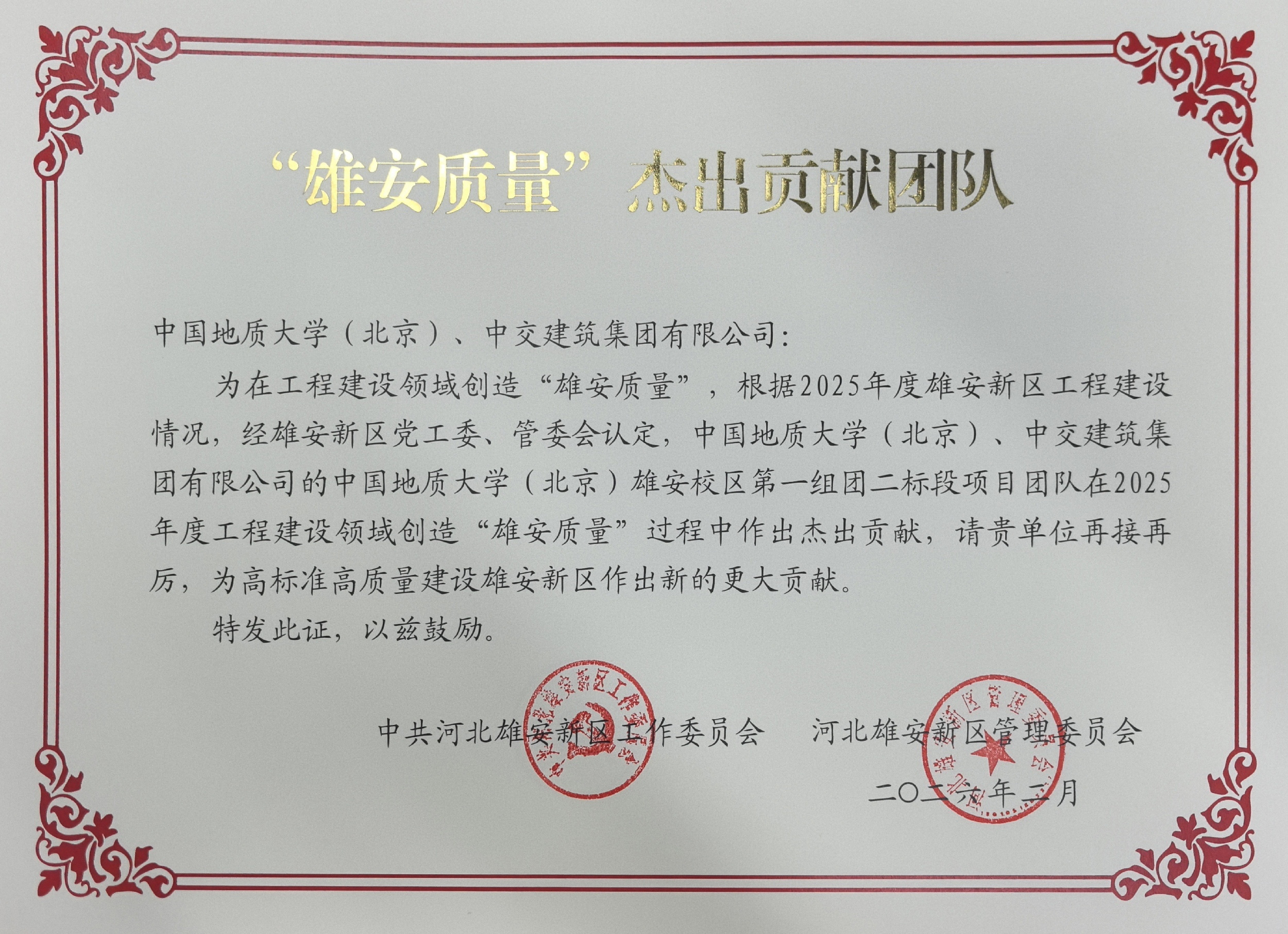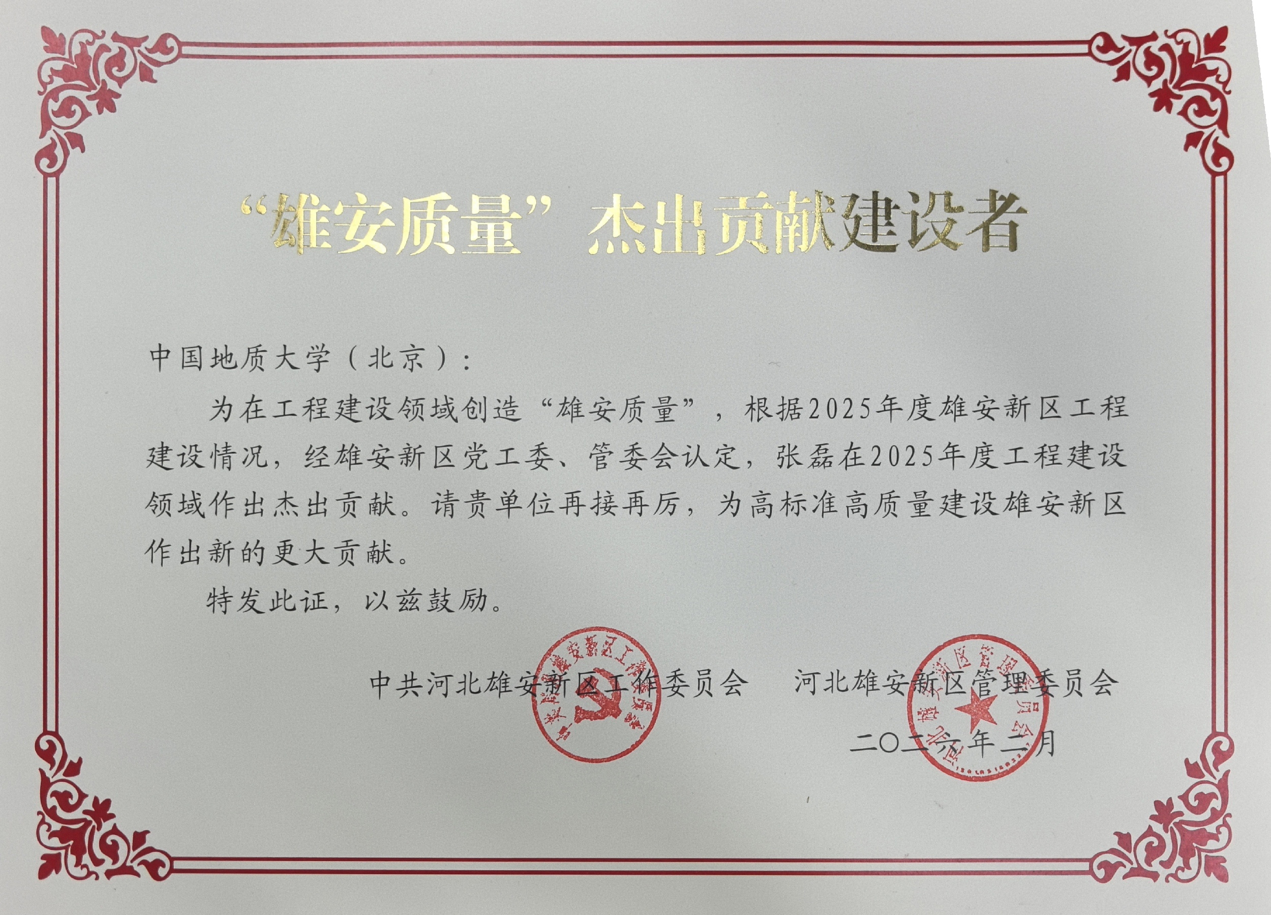 日前,中共河北雄安新区工作委员会、河北雄安新区管委会正式公布2025年度“雄安质量”杰出贡献团队、建设者名单。其中,中国地质大学(北京)雄安校区第一组团二标段项目建设团队荣获“雄安质量”杰出贡献团队称号,张磊同志荣获“雄安质量”杰出贡献建设者称号。