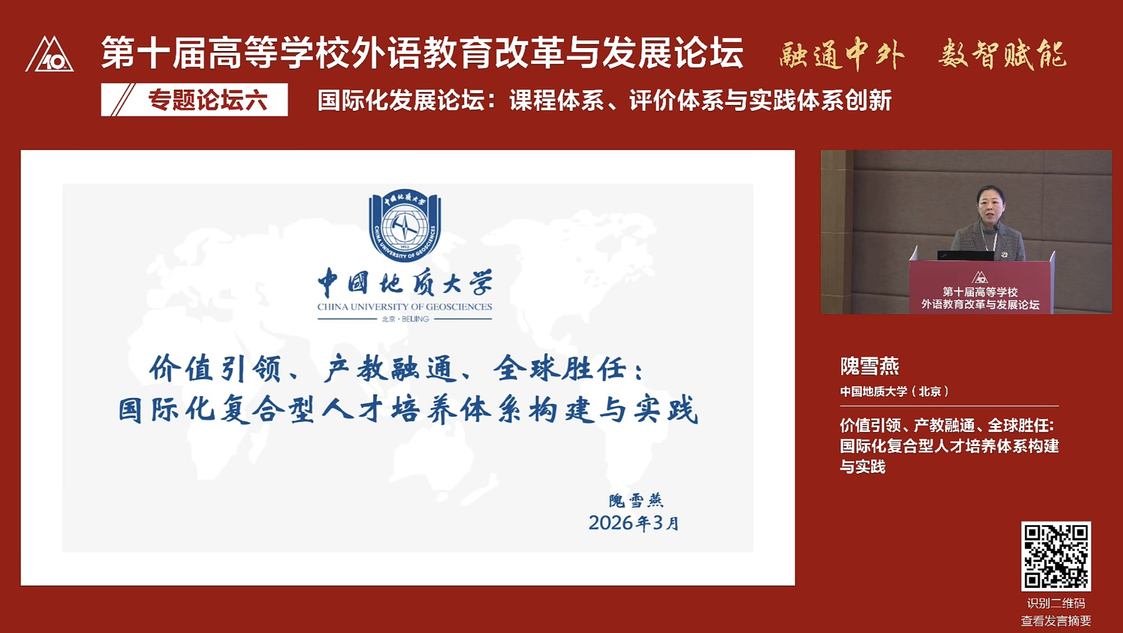 3月20-21日,第十届高等学校外语教育改革与发展论坛在北京召开。论坛以“融通中外,数智赋能”为核心主题,聚焦外语教育改革、国际化人才培养与教育数字化转型。我校外国语学院院长隗雪燕教授受邀出席并作专题报告。